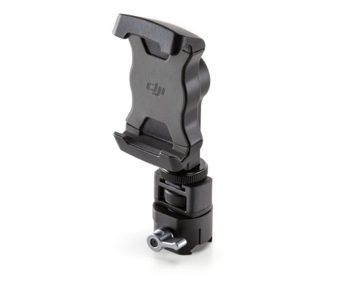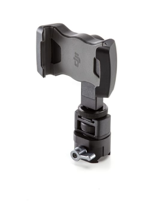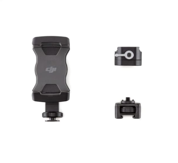 Uchwyt na telefon DJI R zabezpiecza telefon w trakcie monitorowania, używania funkcji ActiveTrack 3.0 oraz Force Mobile. Posaida mocowanie cold shoe, NATO oraz gwinty 1/4"-20. Uchwyt w łatwy sposób może zmienić orientację z pionowej na poziomą aby ułatwić monitorowanie.