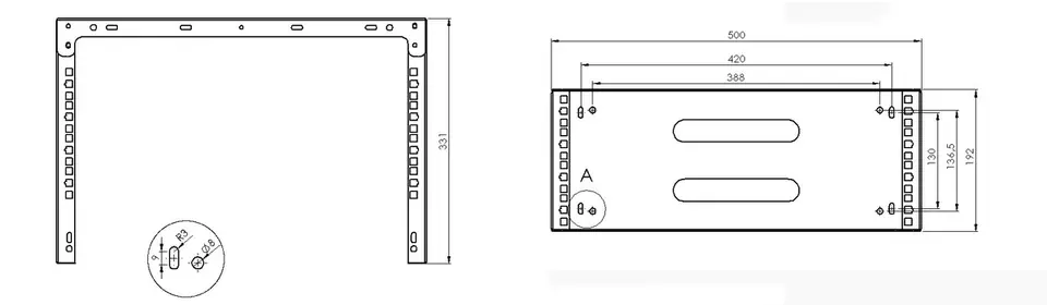 Uchwyt Rack przystosowany do montażu bezpośrednio do ściany. Zaprojektowany w standardzie 19". Ułatwia montaż urządzeń do których dostęp nie musi być zabezpieczony szafami serwerowymi. Dodatkowo na każdym uchwycie są otwory od góry i dołu w standardzie 19" do zamocowania dodatkowych mniejszych urządzeń.
