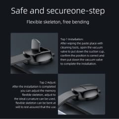W zależności od preferencji możesz zamocować uchwyt na szybie lub desce rozdzielczej. Uniwersalne mocowanie zapewnia solidne trzymanie i wygodną obsługę telefonu niezależnie od wybranego miejsca.