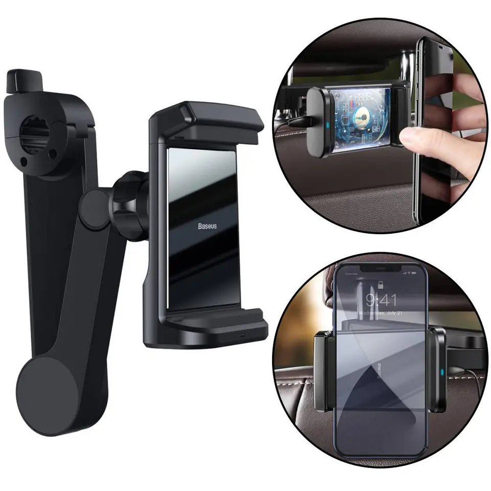 Uniwersalny uchwyt samochodowy do telefonu, przeznaczony do zamontowania na zagłówku fotela. Stworzony z myślą o urządzeniach o przekątnej ekranu od 4,7 do 6,5 cala. Doskonały sposób na uprzyjemnienie podróży pasażerów bez konieczności męczącego trzymania sprzętu w rękach.