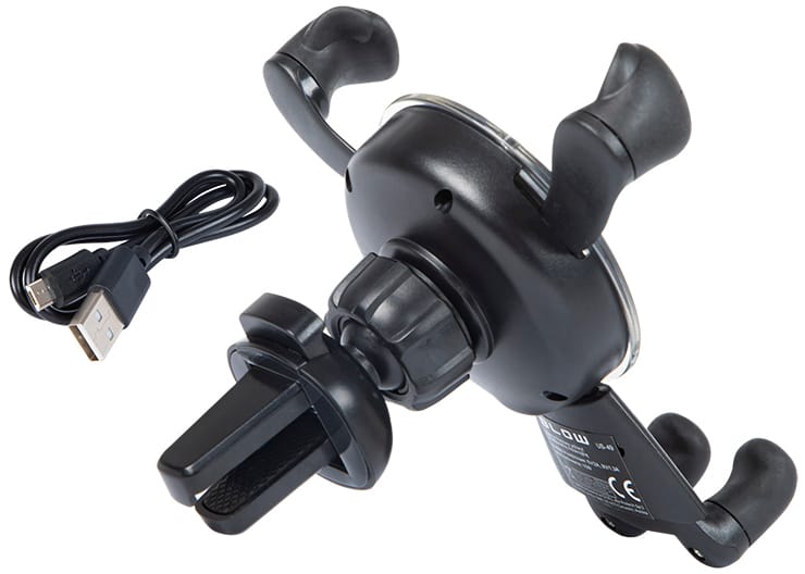 Grawitacyjny uchwyt samochodowy z ładowarką indukcyjną do zamontowania na kratce wentylacyjnej auta. Produkt jest niezwykle prosty w obsłudze, wystarczy odłożyć na niego telefon, a szczęki zamkną się automatycznie. Posiada trójkątną konstrukcję zapewniającą stabilność podczas jazdy, duże możliwości regulacji oraz gumowe nakładki, a także specjalne wycięcie które umożliwia podłączenie ładowarki.