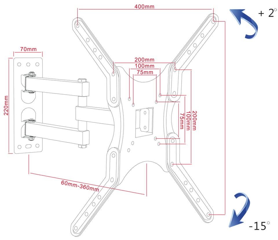 Pełen zakres regulacji w pionie i poziomie. Uchwyt idealny zarówno do małych jak i średnich telewizorów. Szeroka płyta ścienna doskonale rozkłada ciężar telewizora.