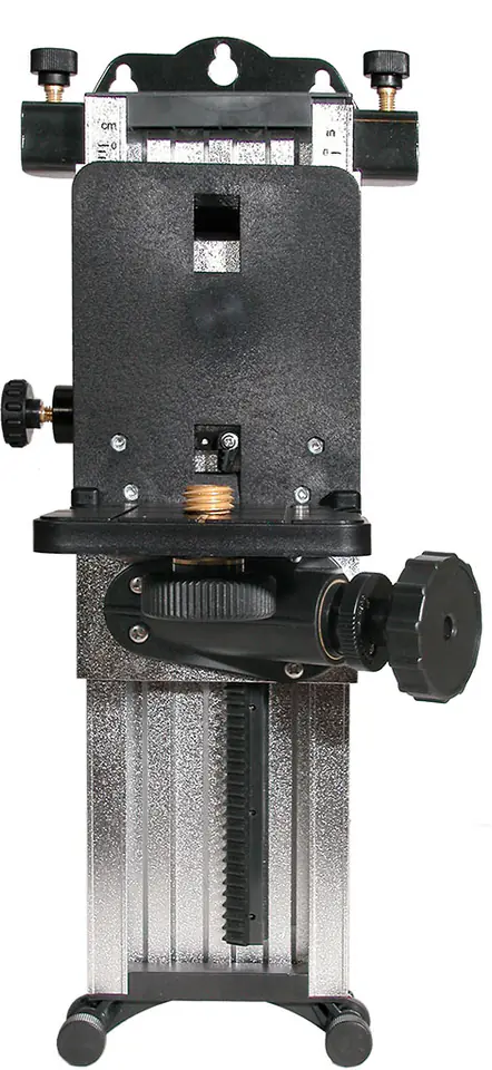 Po zamocowaniu uchwytu na ścianie użytkownik przykręca instrument do ruchomej podstawki, której wysokość może następnie ustawić za pomocą precyzyjnej śruby regulacyjnej.