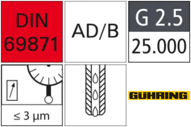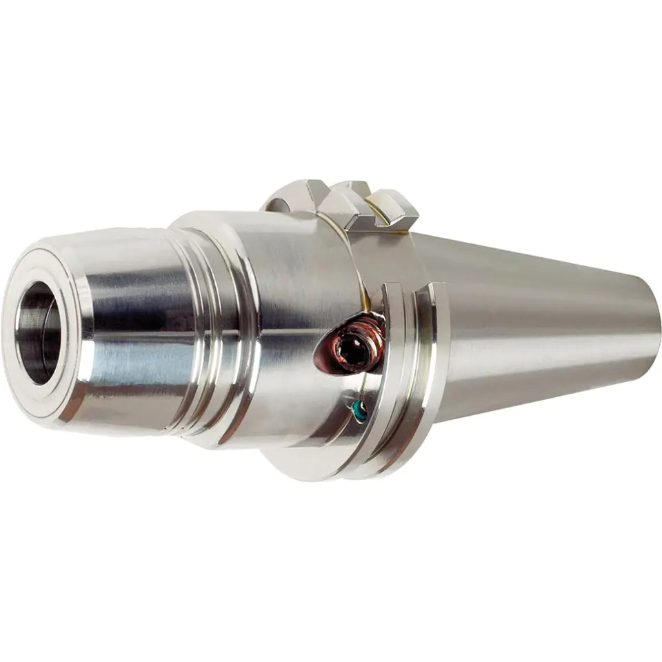 Wykonanie: SK 40 DIN 69871, kształt AD/B, dokładność wyważenia: G 2,5/25.000 obr./min, regulacja długości osiowej, dla tolerancji chwytu narzędzia h6. Za pomocą klucza sześciokątnego z uchwytem poprzecznym olej hydrauliczny zostaje sprężony przez hydrauliczny zestaw mocujący (śrubę dociskową, sworzeń dociskowy i uszczelkę). W wyniku oddziaływania wytworzonego ciśnienia dochodzi do równomiernego odkształcania tulei rozprężnej, co prowadzi do precyzyjnego zacisku chwytu narzędziowego z minimalnym biciem promieniowym (maks. 3 µm). Otwory dla formy B zamknięte przy dostawie za pomocą śrub gwintowanych