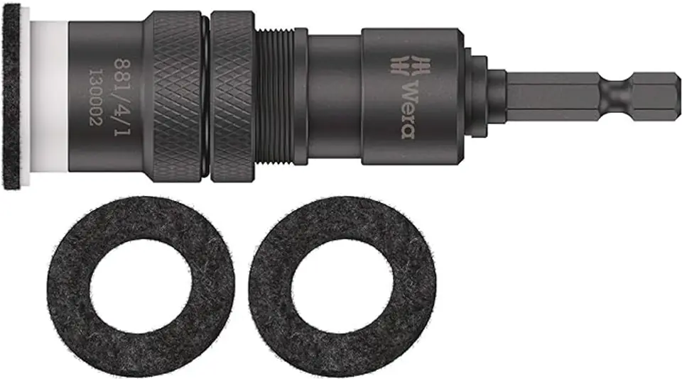 Uchwyt do bitów 881/4/1 ze zmiennym ograniczeniem głębokości wkręcania i pierścieniem filcowym zapewnia równomierną głębokość pogłębiania i chroni powierzchnie przed śladami szlifowania.