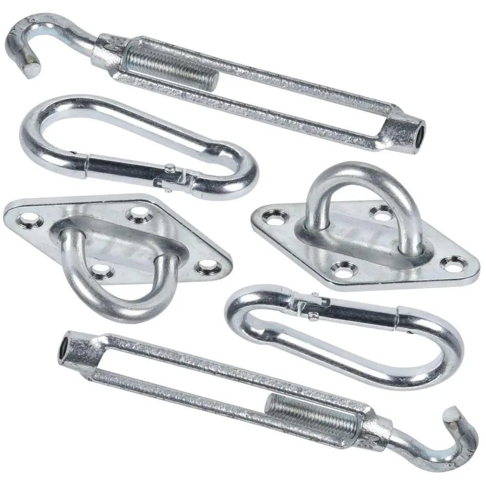 Uchwyty na płachtę przeciwsłoneczną baldachim 6 szt. Zestaw, który pozwoli Ci na przymocowanie płachty przeciwsłonecznej nad stołem ogrodowym. Odpoczynek w ogrodzie nawet podczas gorącej pogody stanie się przyjemniejszy ze względu na cień. Specyfikacja techniczna: Ilość sztuk w zestawie: 6 szt. Materiał: cynk