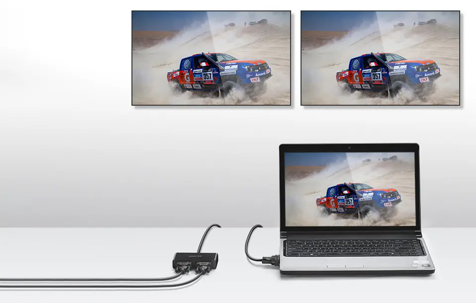 Rozdzielacz nie rozszerza obrazu, ale go powiela. Dzięki niemu możesz zyskać wygodny podgląd na 2 dodatkowych wyświetlaczach. Wykorzystaj tę możliwość tak, jak potrzebujesz - na przykład przygotuj doskonałą prezentację, która dzięki wykorzystaniu 2 ekranów zainteresuje Twoich słuchaczy.