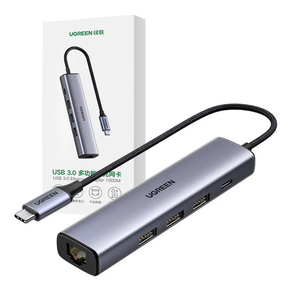 Ugreen wielofunkcyjny adapter HUB USB Typ C - 3 x USB / Ethernet RJ-45 / USB Typ C PD szary (CM475)
