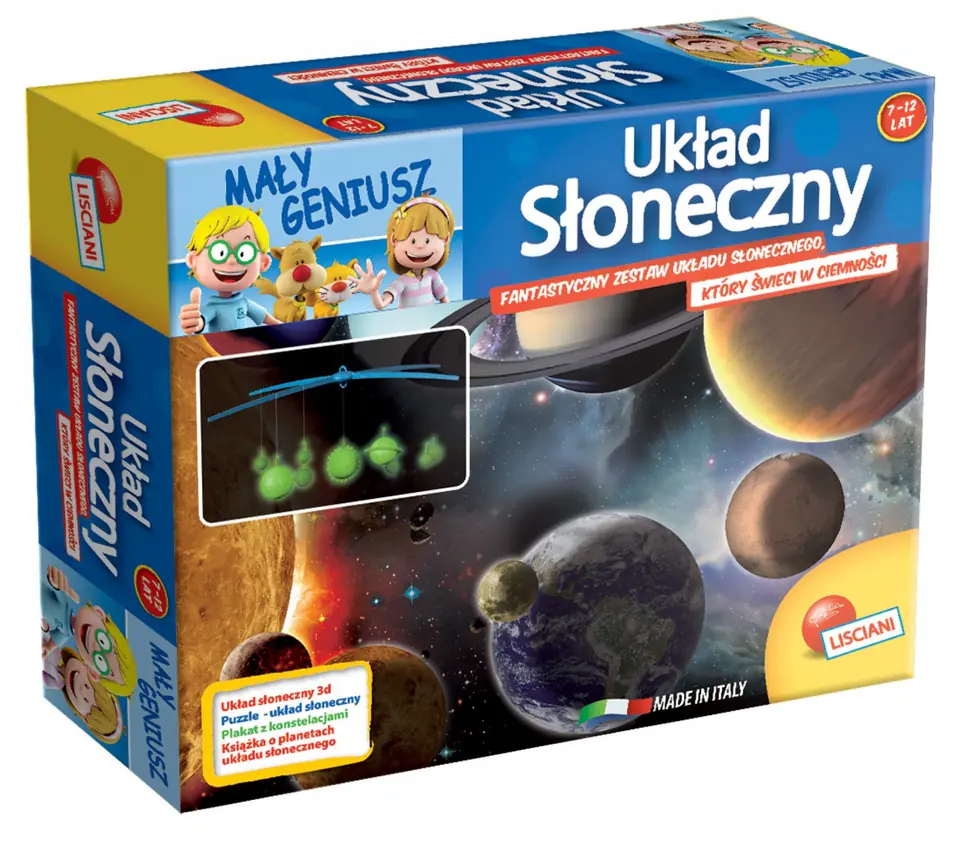 Zestaw do stworzenia prawdziwego modelu Układu Słonecznego! Opakowanie zawiera planety wykonane z fluorescencyjnego plastiku, dzięki czemu świecą w ciemności, ramię do zawieszenia planet, duży plakat z gwiazdozbiorami, puzzle z Ukladem Słonecznym oraz instrukcję.