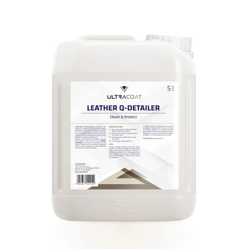 Leather Q-Detailer to środek do czyszczenia i zabezpieczenia elementów skórzanych. Sprawdzi się zarówno przy pielęgnacji wnętrz aut, ale również siedzisk motocykli i wnętrz łodzi. Posiada przyjemny kokosowy zapach, a jego skład dobraliśmy tak, aby był w pełni bezpieczny dla powierzchni oraz użytkownika.