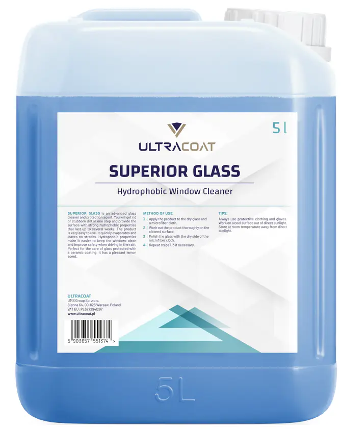 Ultracoat Superior Glass – to nowoczesny płyn do czyszczenia i ochrony szyb. Jednocześnie usuwa uporczywe zanieczyszczenia i zapewnia powierzchni silne właściwości hydrofobowe, które utrzymują się nawet przez kilka tygodni. Produkt jest niezwykle łatwy w użyciu. Błyskawicznie odparowuje i nie pozostawia smug. Właściwości hydrofobowe ułatwiają utrzymanie szyb w czystości oraz zwiększają bezpieczeństwo podczas jazdy w deszczu.