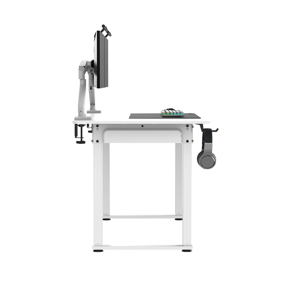 Pod blatem znajdują się dwa elastyczne kosze na kable, które pomagają utrzymać porządek. Dodatkowo na przedniej lewej stronie zamontowany jest uchwyt na słuchawki lub pad, co zwiększa komfort i wygodę użytkowania.