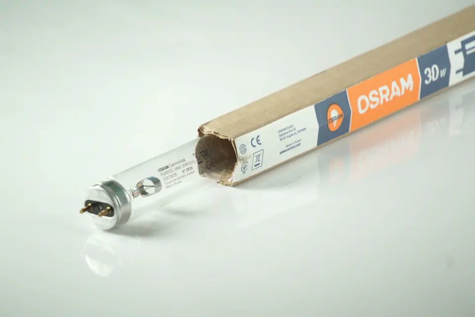 TYP 30W UV-C. Promiennik bakterio i wirusobójczy 30 W jest produktem, który nie przepuszcza fal o długości 185nm, które powodują powstawanie ozonu. Posiada ochronną warstwę wewnętrzną skutecznie ograniczającą tłumienie użytecznego zakresu UV-C. Dokładnym zabija nie tylko bakterie, ale także wirusy oraz inne mikroorganizmy. Znak ostrzegawczy wskazuje na emisję promieniowania w zakresie UV-C. Długość 894,60mm. Żywotność: 8000godzin. Gniazdo G13. Przeznaczona do: NBVE 60, 60/30, 60860. NBV 30, 2x30