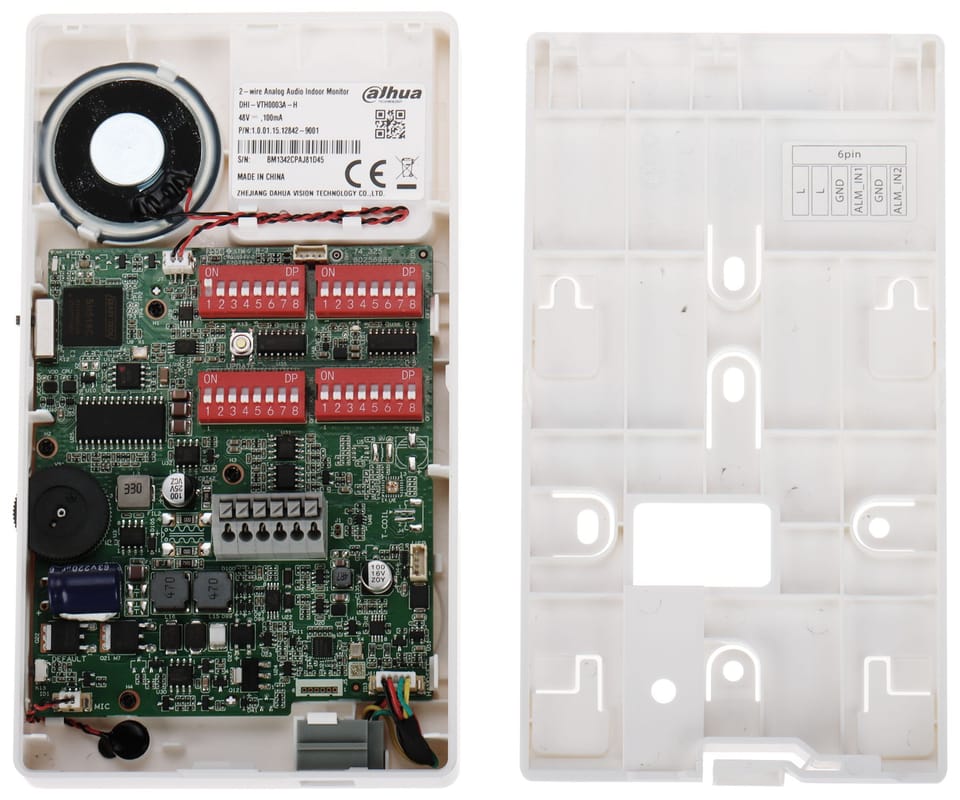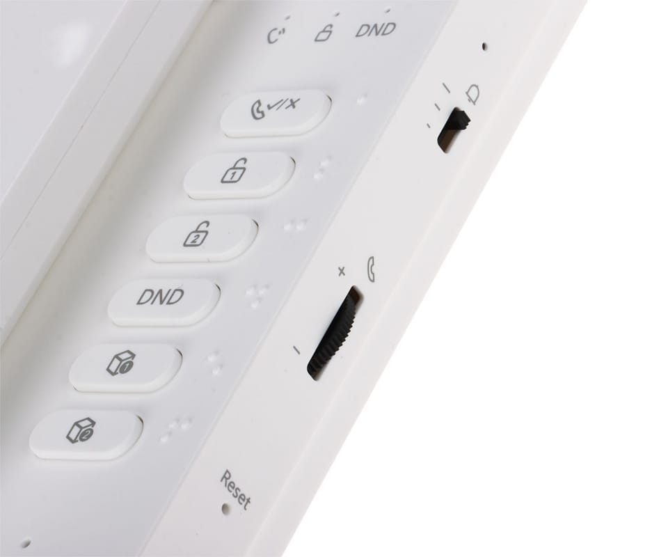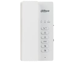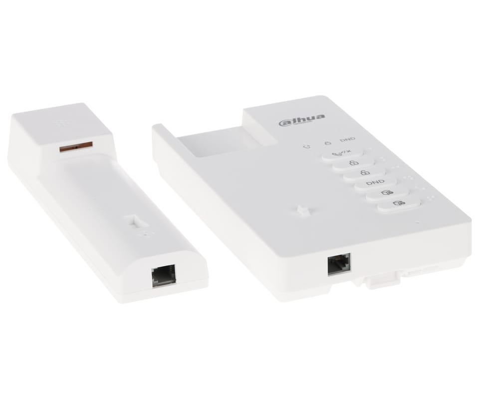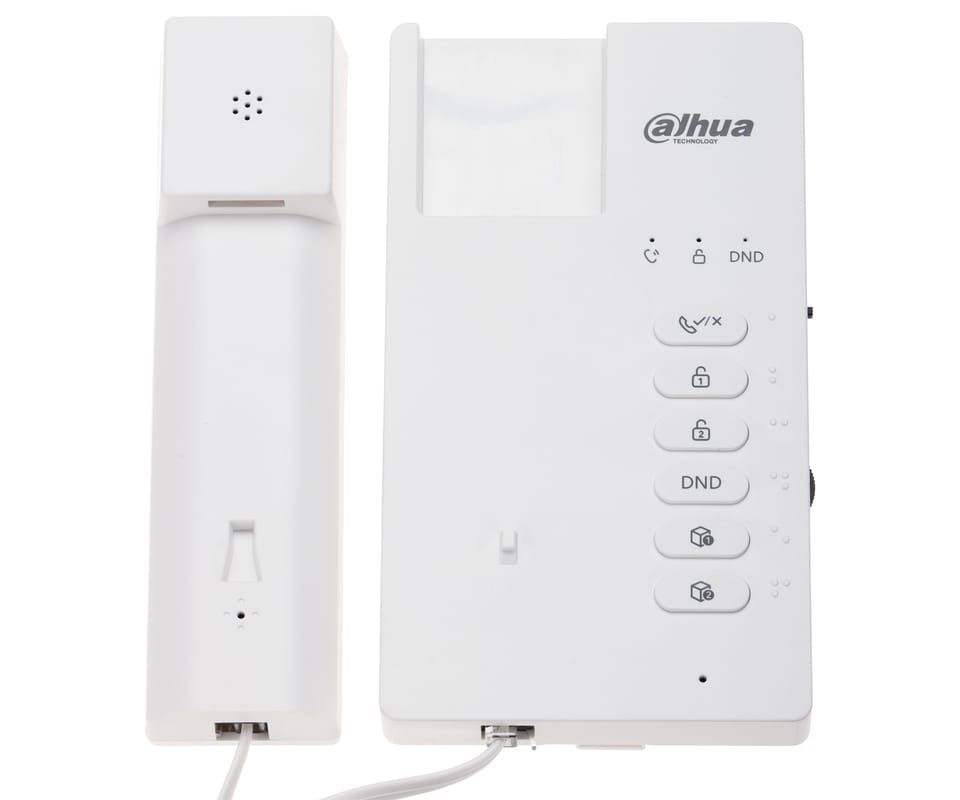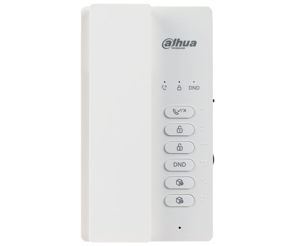 DHI-VTH0003A-H to 2-żyłowy, analogowy unifon z słuchawką, obsługujący rozmowę dwukierunkową (half-duplex) z panelem bramowym. Zastosowano mechaniczne przyciski do szybkiej obsługi (odbiór, otwarcie, DND, wyciszenie), regulację głośności dzwonków i interkomu oraz 2 wejścia alarmowe do podłączenia dzwonków; dostępne są też własne dzwonki i 4 diody statusu. Wspierana jest konfiguracja monitora głównego i podrzędnych (do 2 rozszerzeń) oraz odbiór połączeń grupowych, a zasilanie jest dostarczane przez dystrybutor (zasilacz kupowany osobno).