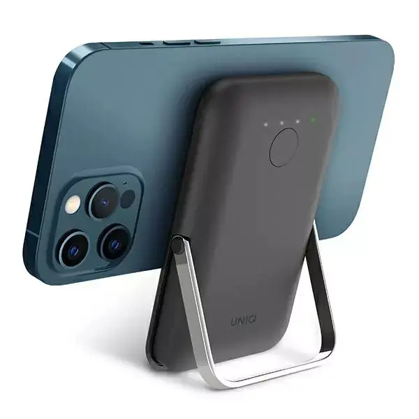 UNIQ Powerbank Hoveo - to magnetyczny, bezprzewodowy power bank o mocy do 20W wejściem USB-C obsługujący szybkie ładowanie PD. Power bank posiada wysuwaną aluminiową podstawkę dzięki której możesz ładować swój telefon i jednocześnie oglądać filmy bez użycia rąk.
