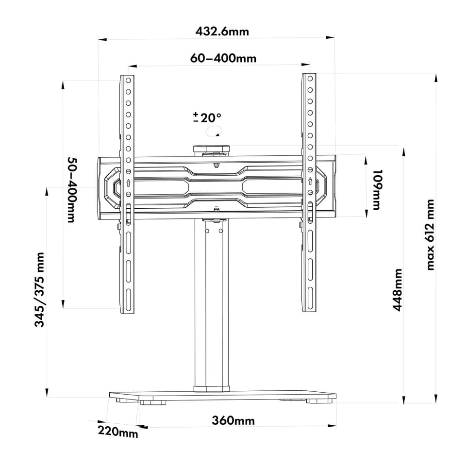 Specyfikacja- Producent: Maclean- Model: MC-132- Kolor: czarny- Maksymalne obciążenie: 35 kg- Wymiary: 432,6 x 220 x 612 mm- Minimalny/Maksymalny rozstaw w poziomie: 75/400 mm- Minimalny/Maksymalny rozstaw w pionie: 50/400 mm- Możliwość obrotu telewizora: +20/-20°- Materiały wykonania: stal malowana proszkowo, szkło hartowane, tworzywo sztuczne- Wymiary podstawy: 360x220 mm- Grubość podstawy: 6 mm- Antypoślizgowe podkładki- 2 stopnie regulacji wysokości ekranu: 345 / 375 mm- Przeznaczony dla telewizorów/monitorów o przekątnej ekranu: od 32 do 55"- W komplecie zestaw śrub montażowych oraz instrukcja montażu- Rozmiar dołączonych śrub do telewizora: M6x20, M8x25, M4x20- VESA: 75x75, 100x100, 100x150, 150x100, 100x200, 200x100, 150x150, 200x200, 300x200, 400x200, 300x300, 400x300, 400x400 mm