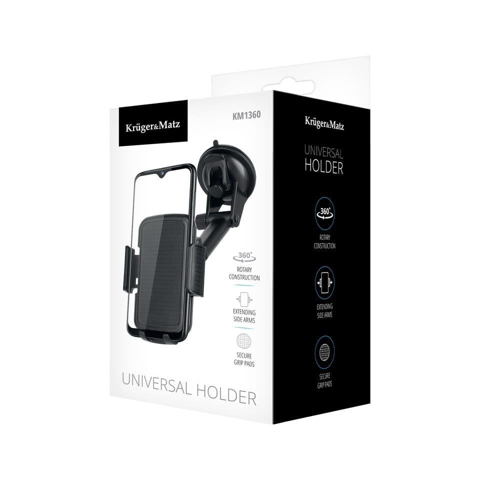 Uchwyt na telefon do samochodu Kruger&Matz posiada obrotową głowicę 360°, dzięki której ustawisz smartfon w odpowiedniej orientacji i pod właściwym kątem. Co ważne, możliwość regulacji zarówno ramion bocznych, jak też uchwytu dolnego w połączeniu z mocną przyssawką i solidną konstrukcją ramienia gwarantują doskonałą stabilizację. Możesz mieć pewność, że Twój smartfon nie upadnie, nawet podczas poruszania się po nierównej drodze.