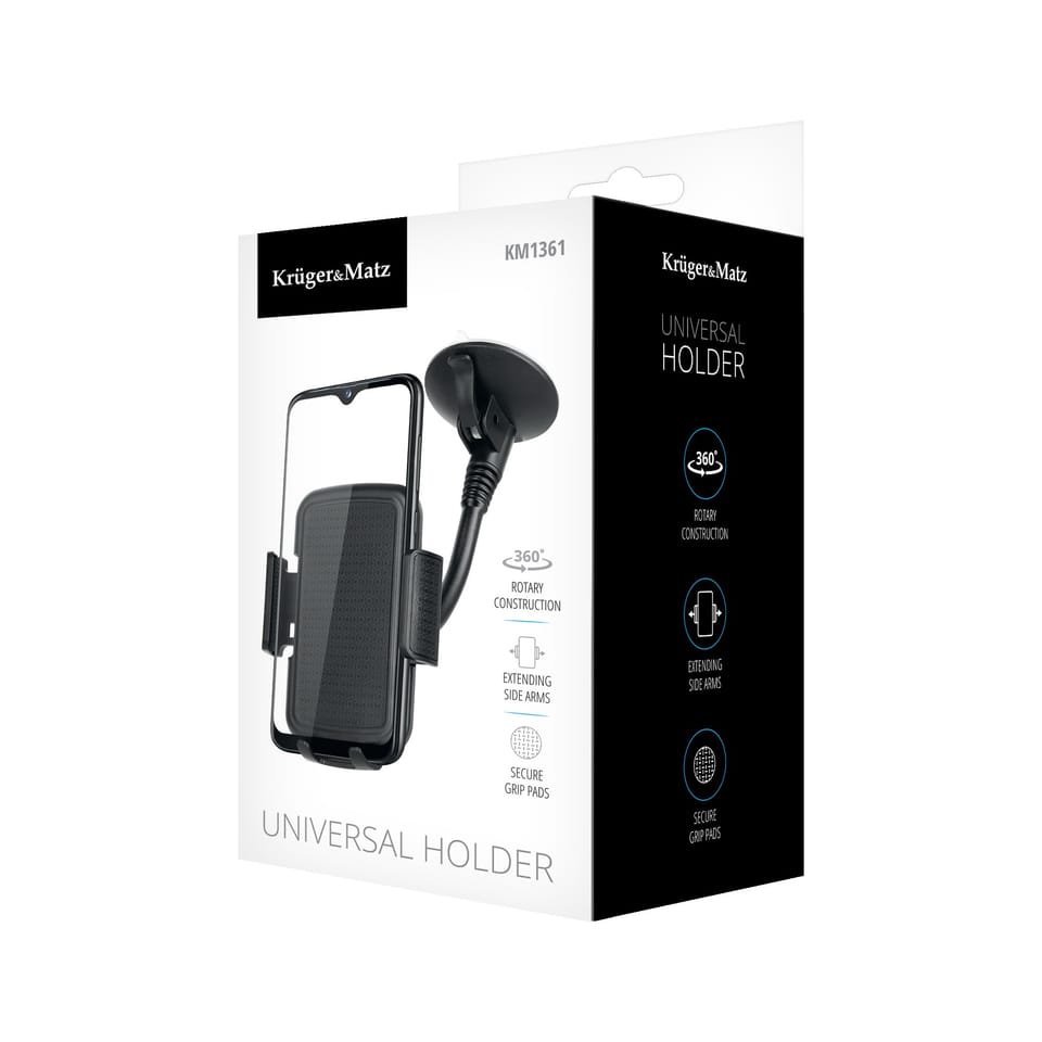 Samochodowy uchwyt na telefon Kruger&Matz umożliwia zarówno regulację ramion bocznych – w zakresie 65-115 mm, jak też uchwytu dolnego. Taka uniwersalność sprawia, że z tym akcesorium będą kompatybilne urządzenia mobilne o różnych wielkościach wyświetlacza. Warto również zwrócić uwagę na solidną konstrukcję oraz mocną przyssawkę, które zagwarantują stabilne utrzymanie telefonu, nawet podczas jazdy po nierównej drodze.