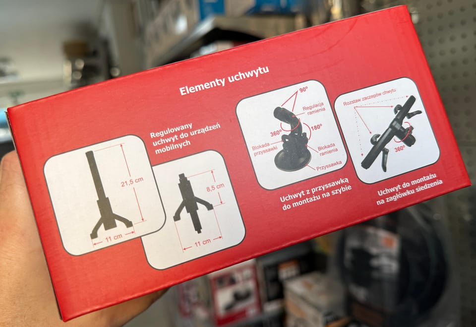 W opakowaniu zestaw do mocowania na szybę oraz za zagłówkiem. Solidny i wytrzymały. Swobodna regulacja.