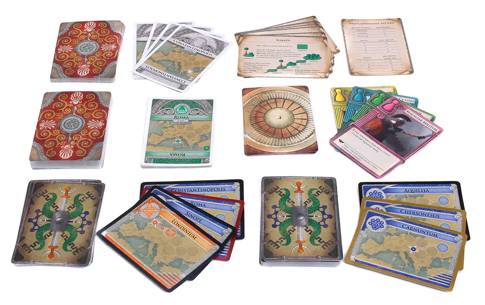 Upadek Rzymu. Chroń Rzym przed najeźdźcami!U szczytu swej potęgi Cesarstwo Rzymskie składało się z terytoriów o łącznej powierzchni ponad pięciu milionów kilometrów kwadratowych. W jego granicach żyło ponad sto milionów ludzi, a na przestrzeni wieków jego uczeni doprowadzili do prawdziwych przełomów w dziedzinie inżynierii, architektury, nauki, sztuki i literatury. W V wieku Cesarstwo straciło stabilność i powoli chyliło się ku upadkowi, z którego miało się już nigdy nie podnieść...Upadek Rzymu to gra kooperacyjna oparta na znanej mechanice. Uczestnicy jednoczą się, by wspólnie pokonać ważne zagrożenie - plemiona germańskie, które najeżdżają Cesarstwo Rzymskie. Wspólnie musicie doprowadzić do ich wyeliminowania lub zawarcia sojuszu, zanim intruzi rozprzestrzenią się po kraju lub opanują Rzym.Na czym to polega?Każdy z graczy otrzymuje kartę postaci z unikalną zdolnością, dającą określony bonus podczas rozgrywki.Na stół wykładana jest mapa Cesarstwa Rzymskiego. Podczas gry w różnych jej obszarach będą się pojawiali barbarzyńcy - naszym zadaniem jest ich eliminowanie.Podczas swojej tury gracze mogą przemieszczać się po planszy, umacniać pozycje miast, rekrutować legionistów tam, gdzie występuje większe zagrożenie, a także zawierać sojusze z wrogimi plemionami.Naszym celem jest wyeliminowanie wszystkich pięciu plemion atakujących Rzym. Aby to osiągnąć musimy zawrzeć z danym najeźdźcą przymierze lub całkowicie usunąć jego przedstawicieli z planszy.Dlaczego pokochasz tę grę?