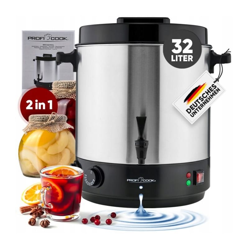 NAJWYŻSZEJ JAKOŚCIEklektyczny garnek do pasteryzacji - Warnik - PodgrzewaczRENOMOWANEJ FIRMY PROFICOOKMODEL: PC-EKA 1283Jeśli szukasz niezawodnego i wygodnego sposobu na pasteryzację swoich domowych przetworów, nasz Warnik 2w1 to idealne rozwiązanie! To funkcjonalne urządzenie łączy w sobie dwie kluczowe funkcje – garnka do pasteryzacji oraz warnika – co pozwala zaoszczędzić miejsce w kuchni, a jednocześnie skutecznie przygotować zapasy na zimę.Idealny na każdą porę rokuMaszyna do konserwowania i podawania gorących napojów ProfiCook 2w1 umożliwia przygotowanie pysznych gorących napojów, takich jak grzane wino, herbata i kawa, i utrzymywanie ich w cieple.Jednocześnie możesz gotować owoce, warzywa czy dżemy i w ten sposób sprawnie uzupełniać zapasyDuża pojemność dla dużych ilości:Dzięki 32-litrowemu zbiornikowi urządzenie to oferuje wystarczająco dużo miejsca, aby ugotować jednocześnie około 14 słoików o pojemności 1 litra. Oznacza to, że możesz przygotować duże ilości w krótkim czasie, idealne na spotkania rodzinne lub gromadzenie zapasów.Praktyczne funkcje ułatwiające obsługęFunkcja timera pozwala precyzyjnie ustawić czas gotowania, a funkcja utrzymywania ciepła gwarantuje, że potrawy i napoje pozostaną ciepłe i gotowe do spożycia przez dłuższy czas – idealne na przyjęcia i imprezySolidna i łatwa w utrzymaniu konstrukcja:Wysokiej jakości obudowa ze stali nierdzewnej nie tylko nadaje urządzeniu elegancki wygląd, ale także sprawia, że jest wyjątkowo trwałe. Ukryty element grzejny ze stali nierdzewnej zapewnia szybkie i łatwe czyszczenie po użyciuBezpieczeństwo i komfort w jednym:dzięki zabezpieczeniu przed przegrzaniem i wyschnięciem oraz uchwytom Cool Touch korzystanie z tej maszyny do wekowania jest szczególnie bezpieczne. Wyjmowany kranik spustowy umożliwia wygodne i czyste nalewanie gorących napojów bezpośrednio do szklanki – idealne na spotkania towarzyskieWysokiej jakości maszyna do wekowania w obudowie ze stali nierdzewnej:do konserwowania np. owoców, warzyw, dżemówmaszyna do gorących napojów np.: grzanego wina, herbaty, kawyidealna do utrzymywania ciepła i serwowania np. zup, gulaszy, gulaszy, kiełbasek2100 watówPojemność zbiornika 32 litry (ok. 14 szklanek po 1 litr każda)Wymiary wewnętrzne: wysokość 30 cm / średnica 37 cmObudowa ze stali nierdzewnejUkryty element grzejny ze stali nierdzewnej (łatwy do czyszczenia)Ochrona przed przegrzaniem/wrzeniem na suchoCiągła, elektroniczna kontrola temperatury (30°C - 100°C)Funkcja timeraFunkcja utrzymywania ciepłaPodświetlany włącznik/wyłącznik (bryzgoszczelny)Kontrolka temperaturyKontrolka zasilaniaZdejmowany kran spustowy do praktycznego napełniania np. zbiorników. Np. grzane wino, poncz lub inne gorące napoje (łatwe do czyszczenia)Chłodne uchwyty dotykowe (izolowane termicznie)Ochrona przed przegrzaniem/wrzeniem na sucho230 V, 50 Hz, 2100 WJest łatwy w obsłudze, a możliwość precyzyjnego ustawienia temperatury i czasu pasteryzacji daje Ci pełną kontrolę nad procesem. Zainwestuj w nasz Warnik 2w1 i ciesz się smakiem domowych przetworów przez cały rok – oszczędzając czas, miejsce i energię