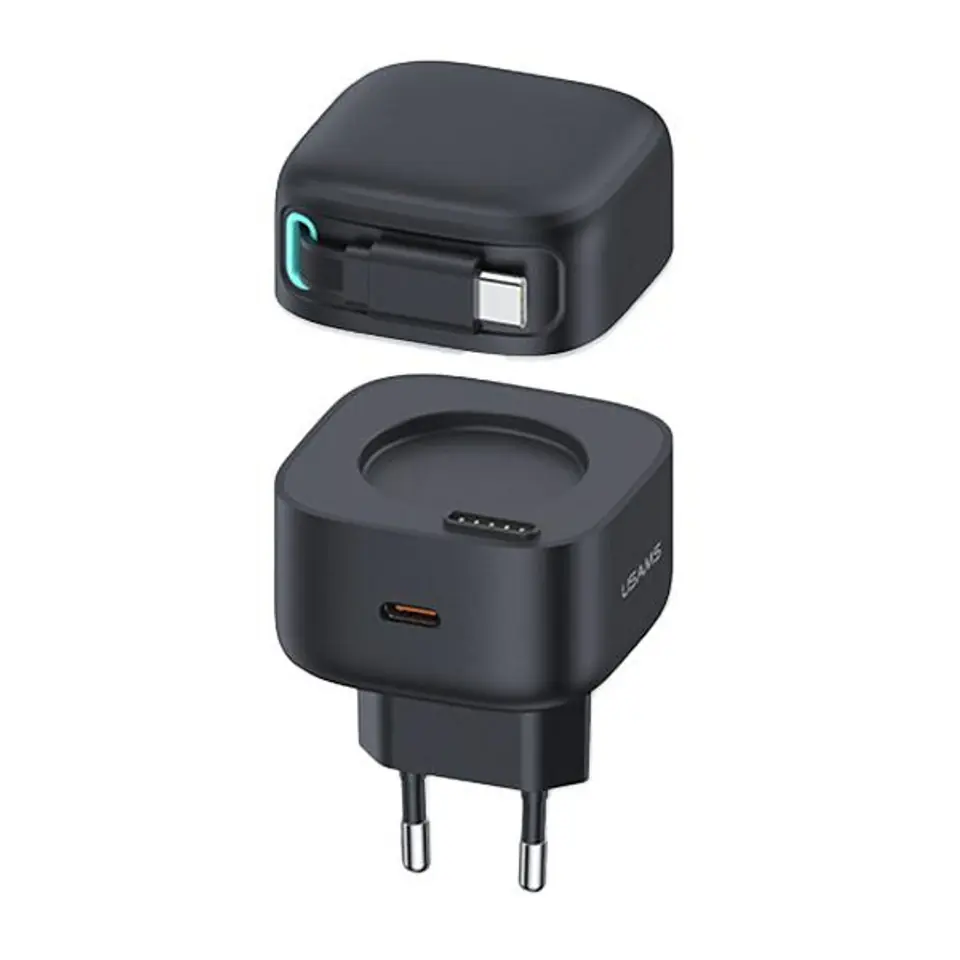 USAMS Ład. siec. 1xUSB-C ze zwijanymkablem USB-C Retractable PD+QC 35W Gan Fast Charging czarny/black XMF Series CC202TC01 US-CC202