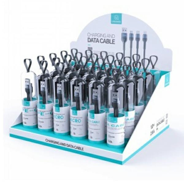 Zestaw 30 sztuk kabli Usams w aluminiowym oplocie U55 z ekspozytorem10 szt. microUSB10 szt. Lightning10 szt. USB-CKażdy kabel U55 jest wyposażony w Smart Chip - inteligentny układ scalony, który zabezpieczy urządzenie przed niespodziewanymi przepięciami.Produkt zapewnia szybkie ładowanie 2A i transmisję danych w tym samym czasie.- Aluminiowy splot zapewni długie i bezawaryjne użytkowanie przewodu, bez ryzyka mechanicznych uszkodzeń.- Delikatne światło wskaźnika ładowania- Wzmocnione końcówki elastycznym materiałem- Materiał: stop aluminium, elastyczny i trwały w użyciu.- Stabilne i szybkie ładowanie 2A i transmisja danych w tym samym czasie- Długość: 1 metr