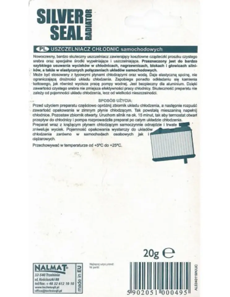 Nowoczesny, bardzo skuteczny uszczelniacz zawierający nanocząsteczki proszku czystego srebra oraz specjalne środki wypełniające i uszczelniające. Przeznaczony jest do bardzo szybkiego usuwania wycieków w chłodniach, nagrzewnicach, blokach i głowicach silników, a także w elastycznych połączeniach układów samochodowych.