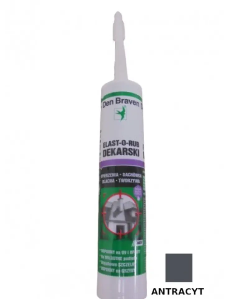 Den Braven Elast-O-Rub Uszczelniacz Dekarski to trwale plastyczno-elastyczny, kauczukowy uszczelniacz dekarski. Idealny do uszczelniania pokryć, rynien i obróbek z blachy. Nadaje się do użytku w dekarstwie. Usuwa przeciek wody. Łatwy w użyciu, każdy majsterkowicz sobie poradzi z aplikacją.