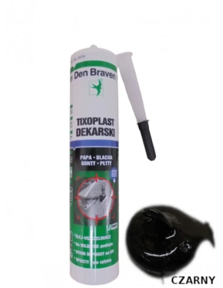 Den Braven Tixoplast Dekarski to trwale plastyczno-elastyczny, bitumiczny uszczelniacz-klej dekarski na bazie bitumów i żywic. Sprawdzi się do naprawy i izolacji pokryć dachowych z papy i blachy. Łatwy w użyciu. Odporny na działania atmosferyczne. Wodoodporny. Mrozoodporny.