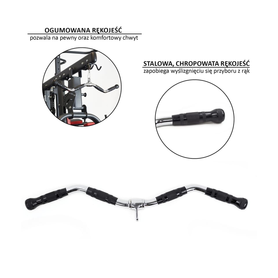 UW13 HMS to drążek przeznaczony do treningu na wyciągu górnym i dolnym. Można wykorzystać go do całej gamy ćwiczeń na różne grupy mięśniowe górnych partii ciała zaczynając od małych grup mięśniowych, jak biceps i triceps, przez przedni i boczny akton mięśni naramiennych, aż po mięśnie najszersze oraz prostownik grzbietu. Długość drążka oraz rozstaw rękojeści dają możliwość ćwiczeń na wąskim i szerokim uchwycie. Skutkuje to efektywnym treningiem. Rękojeści ustawione są pod kątem. Dzięki temu w trakcie każdego ćwiczenia angażują alternatywne przyczepy mięśniowe w stosunku do prostego uchwytu. Ogumowana rękojeść pozwala na pewny oraz komfortowy chwyt, co zapobiega wyślizgnięciu się przyboru z rąk. Uchwyt wykonany jest ze stali. Umożliwia to trening ze znacznym obciążeniem. Model UW13 HMS pomoże łatwo i symetralnie rozbudować swoje mięśnie. Przeznaczony do wyciągu górnego i dolnego Specyfikacja: Materiał: chromowana stal Długość części chwytnej (mm): 110-150 Średnica części chwytnej (mm): 32 Ilość miejsc chwytnych: 4 Rozstaw rękojeści (mm): 250-605 Uchwyt: gumowany Wymiary: długość (mm): 39 szerokość (mm): 760 wysokość (mm): 105 średnica (mm): 25 Średnica otworu (mm): 15 Waga produktu (kg): 3.44 Uwagi: Roczna gwarancja Importer: Abisal Sp. z o.o.| Polska | 41-807 Zabrze | ul. Pyskowicka 17 | e-mail: abisal@abisal.plAbisal Sp. z o.o. deklaruje, iż produkty sprzedawane przez firmę są bezpieczne i spełniają wymagania zawarte w Ustawie o ogólnym bezpieczeństwie produktów z dnia 12 grudnia 2003r. (Dz.U. z dnia 31 grudnia 2003r.)