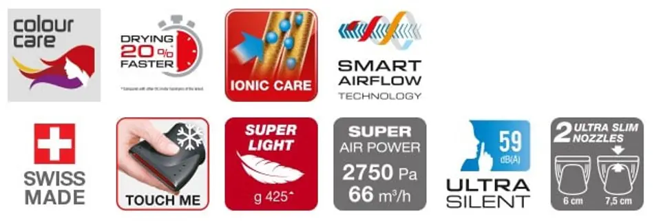 Profesjonalna i bardzo lekka suszarka do włosów Valera VANITY COMFORT Pretty Purple - Mocny i wytrzymały silnik DC-PRO Motor - Moc - 2000 W - Przycisk chłodnego nawiewu - Prędkość nawiewu - 120 km/h - ULTRA CICHA - głośność tylko 59 db - SMART AIR FLOW - technologia optymalnego przepływu powietrza przez suszarkę daje bardzo wysokie osiągi - Dzięki SMART AIR FLOW czas suszenia jest krótszy nawet o 20%** - 6 kombinacji nawiewu/temperatury - 2 wąskie dysze koncentrujące nadmuch powietrza ( 6 i 7,5 cm ) - Wąska nienagrzewająca się dysza TOUCH ME - Wytrzymałość silnika - 1200 godzin pracy - Bardzo niska waga - tylko 425g ( waga bez kabla ) - Generator jonów - 3 metrowy obrotowy kabel ROTOCORD z uchwytem SuperFlex - Zdejmowana metalowa osłona silnika - Produkowana w Szwajcarii SMART AIR FLOW - nowoczesna konstrukcja suszarek Valera optymalizuje przepływa powietrza przez suszarkę. Dzięki niej zwiększamy ilość powietrza przepływającego przez suszarkę i jego prędkość. Smart Air Flow dodatkowo zmniejsza hałas generowany przez przepływające powietrze.