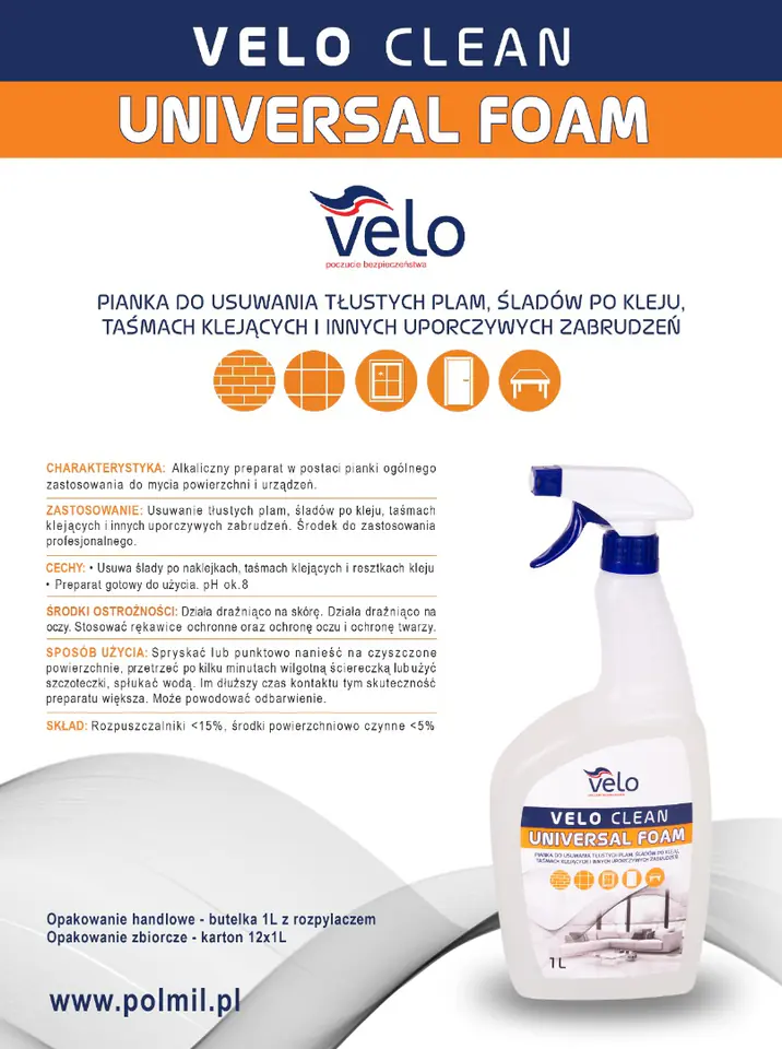 VELO CLEAN UNIVERSAL FOAM 1l - alkaliczna pianka ogólnego zastosowania do mycia powierzchni i urządzeń CHARAKTERYSTYKA: Alkaiczny preparat w postaci piani do ogólnego zastosowania do mycia powierzchni i urządzeń. ZASTOSOWANIE: Usuwanie tłustych plam, śladów po kleju, taśmach klejących i innych uporczywych zabrudzeń. Środek do zastosowania profesjonalnego. CECHY: Preparat gotowy do użycia pH. ok. 8 SKŁAD: Rozpuszczalniki