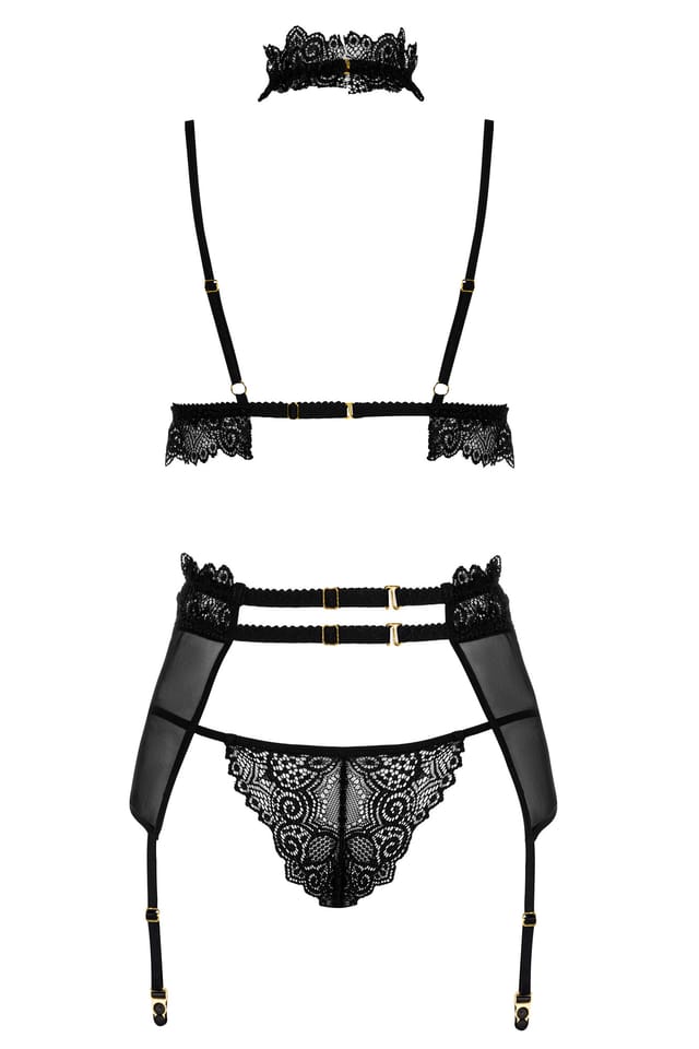 Velvet Sin set to propozycja dla kobiet, które pragną połączenia subtelności i zmysłowej odwagi. Koronkowy biustonosz z paseczkami oraz chokerem tworzy efektowną oprawę dla dekoltu, a pas do pończoch podkreśla linię talii i bioder. Stringi z koronką i paskami dodają całości charakteru, tworząc look, który zachwyca zarówno elegancją, jak i odważnym wyrazem.