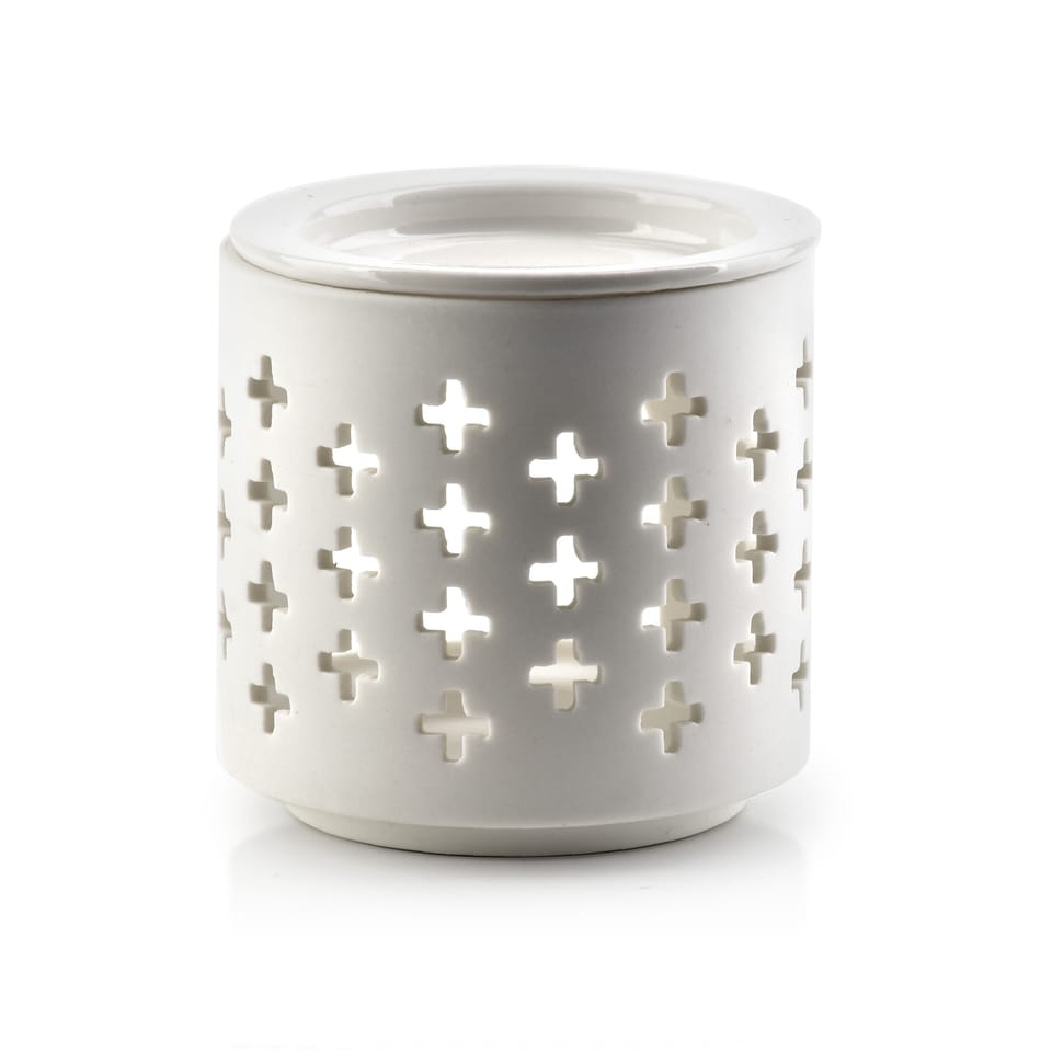 Kominek na olejek zapachowy ceramiczny VESTA - biały matowy dwuelementowy z otworem z góry i z boku wymiary: 7,3x7,3xH:7,5cm