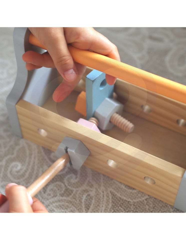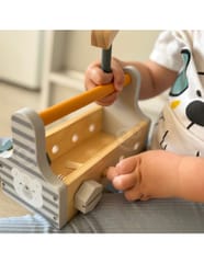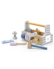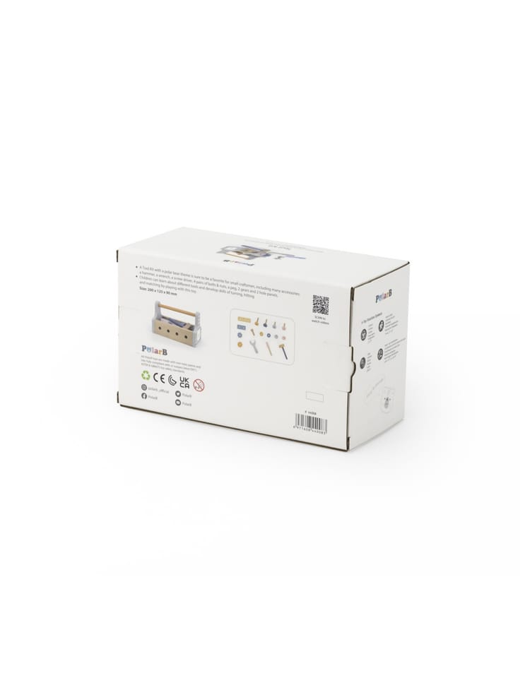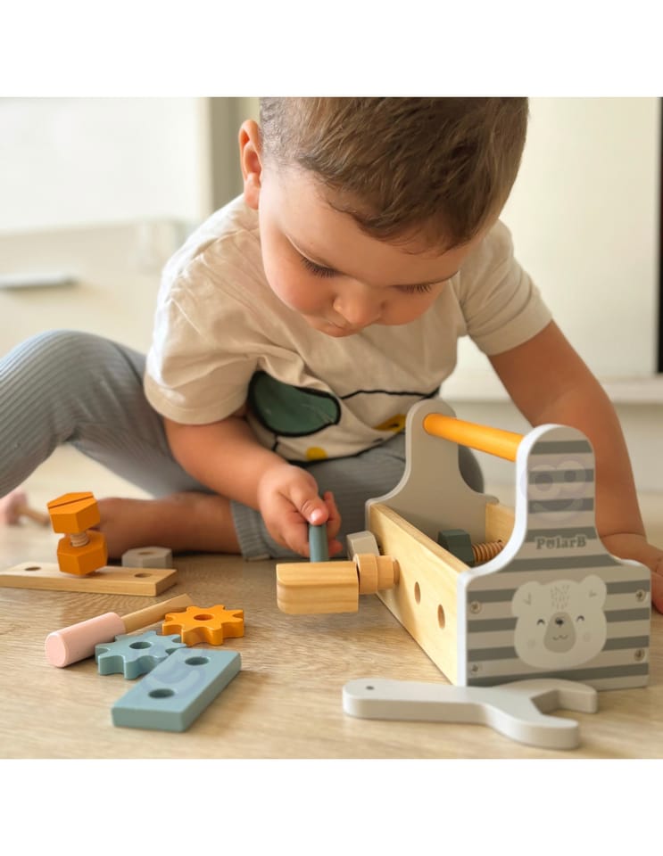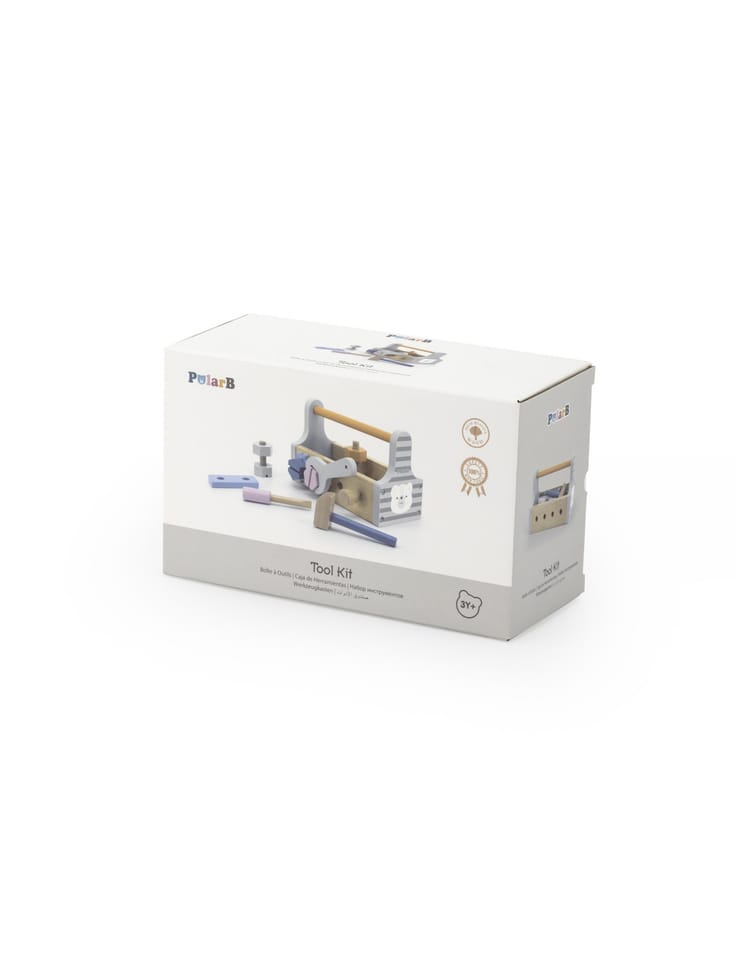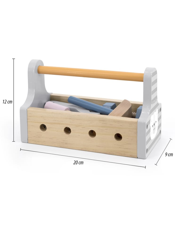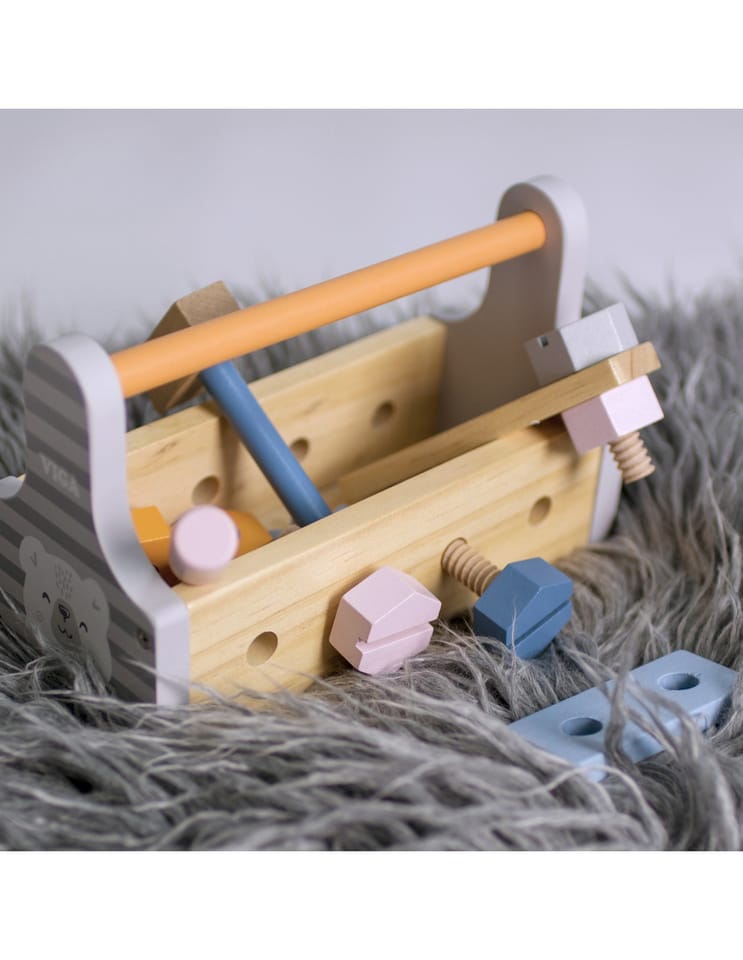Zestaw drewnianych narzędzi marki Viga z serii Polar Bear – całość utrzymana w tonacji pasteli i szarości, połączone z naturalnym kolorem drewna bukowego. Poręczna skrzynka z narzędziami zadowoli każdego małego majsterkowicza który pomaga tacie i dziadkowi w pracach domowych.