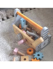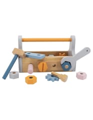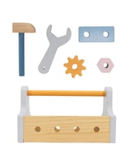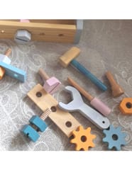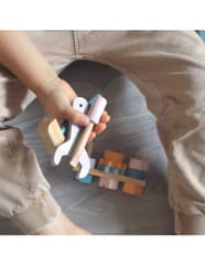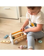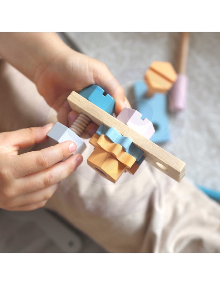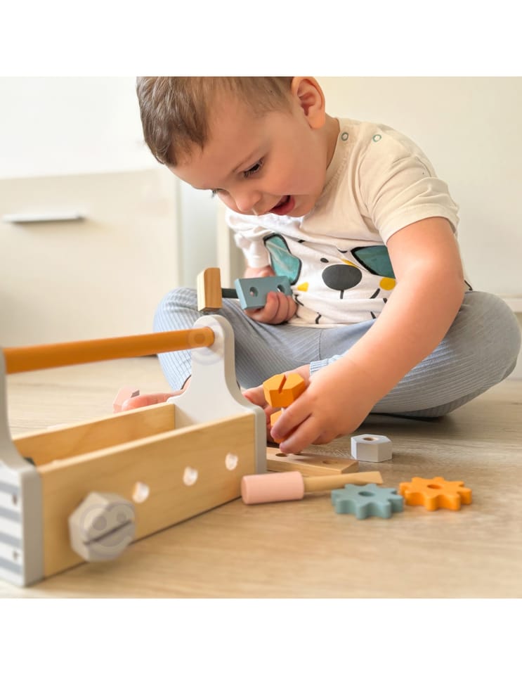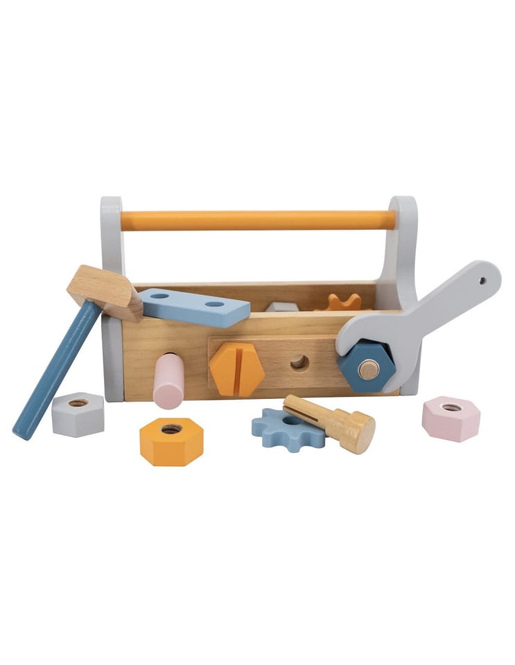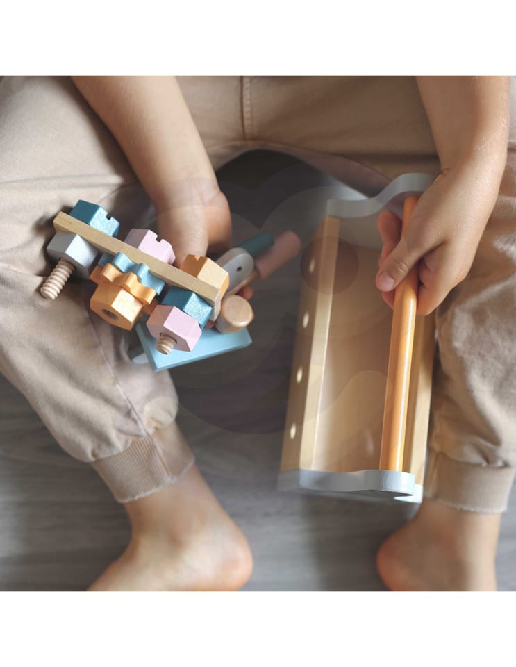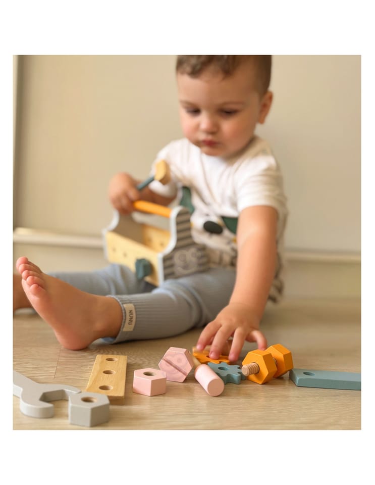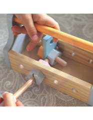 Zestaw drewnianych narzędzi marki Viga z serii Polar Bear – całość utrzymana w tonacji pasteli i szarości, połączone z naturalnym kolorem drewna bukowego. Poręczna skrzynka z narzędziami zadowoli każdego małego majsterkowicza który pomaga tacie i dziadkowi w pracach domowych.