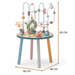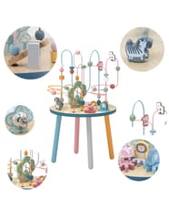 Zabawka składa się ze stolika na którym umieszczone są 4 przestrzenne metalowe pętle z koralikami i figurkami zwierząt niedźwiedzia, wiewiórki i jeża do przesuwania. Na blacie znajdują się również koła zębate, a na nich kolejne postacie zwierząt (lew, słoń i lis) - wystarczy przekręcić, by wszystkie wprowadzić w ruch.