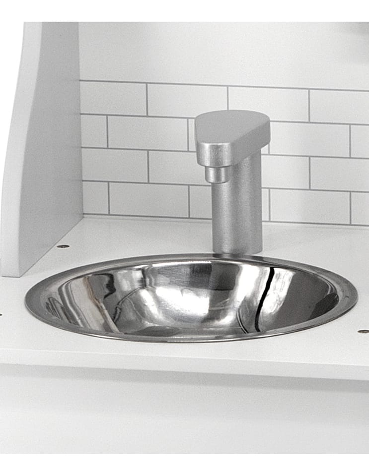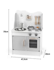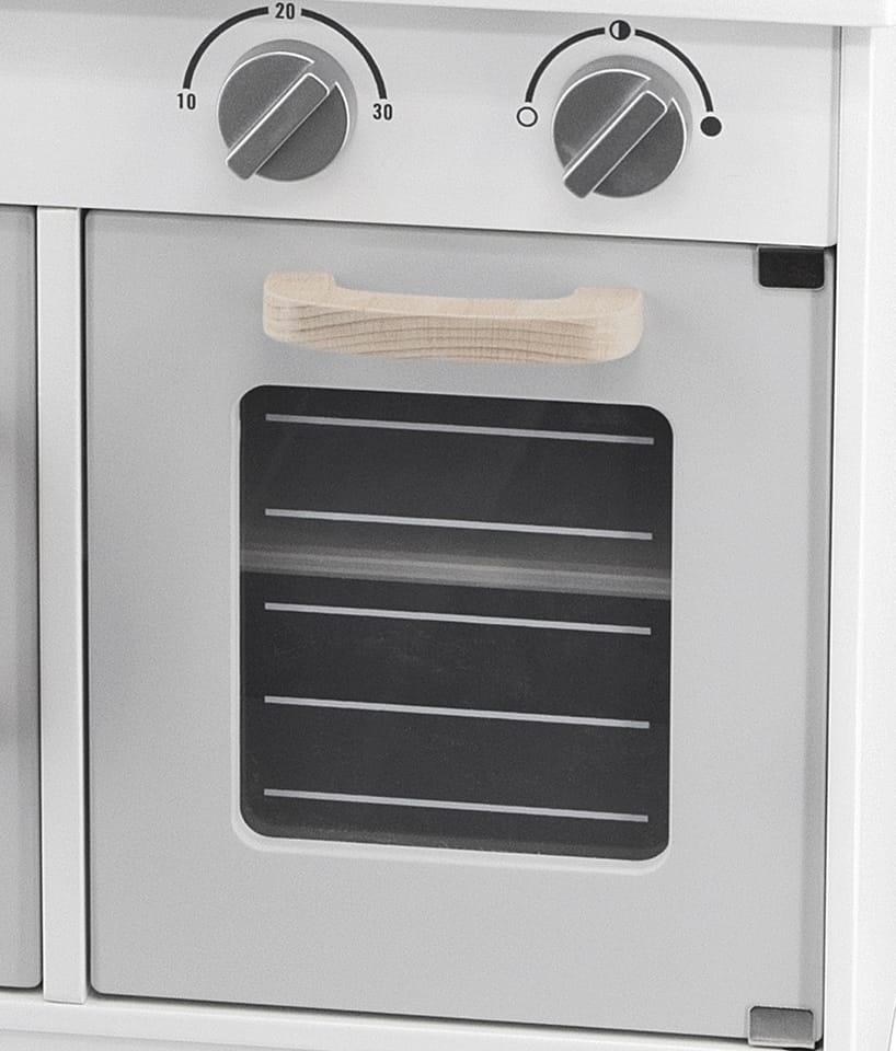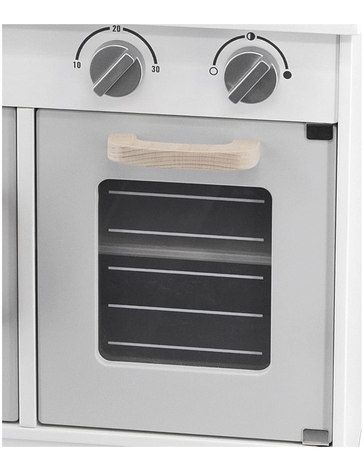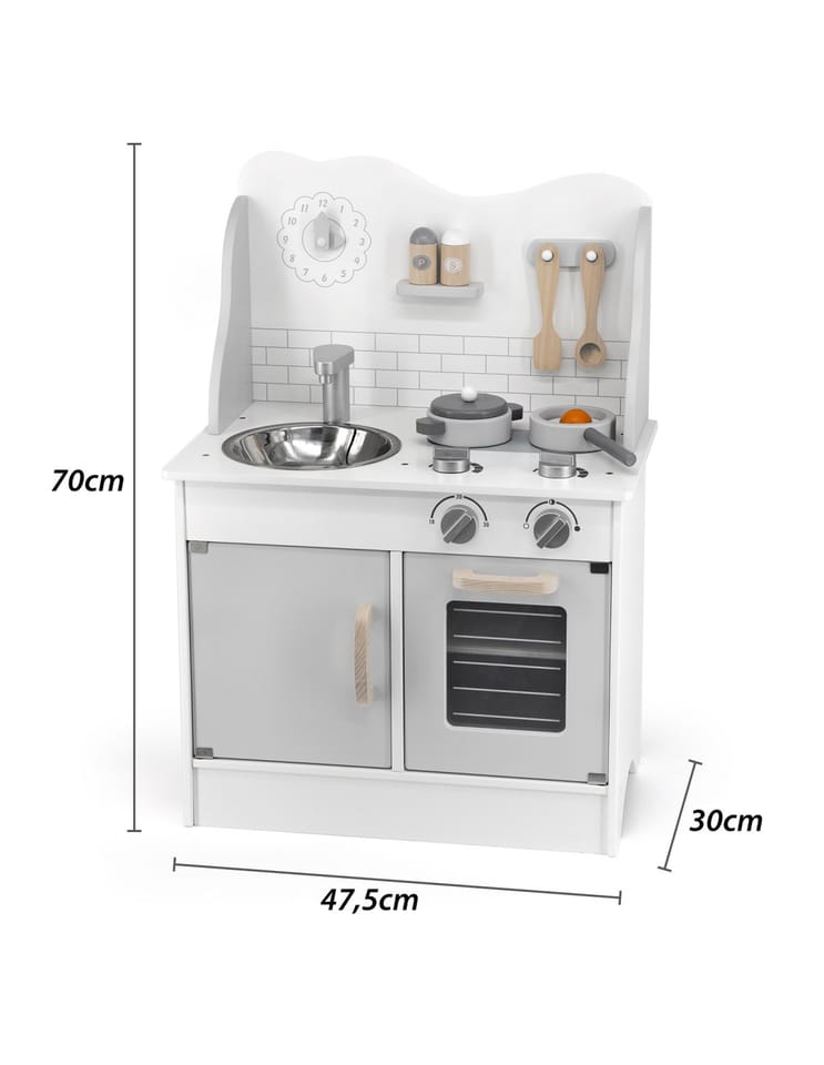 Ta zabawkowa kuchnia w modnym stylu jest wyposażona w pełen zestaw przyborów kuchennych. Komplet zabawek kuchennych zawiera schowki i piekarnik na podstawie, dwie kuchenki, zlew, zegar na górze oraz akcesoria, takie jak patelnia z jajkiem sadzonym, rondel, łopatka, łyżka i dwa słoiki z przyprawami.