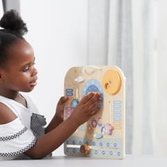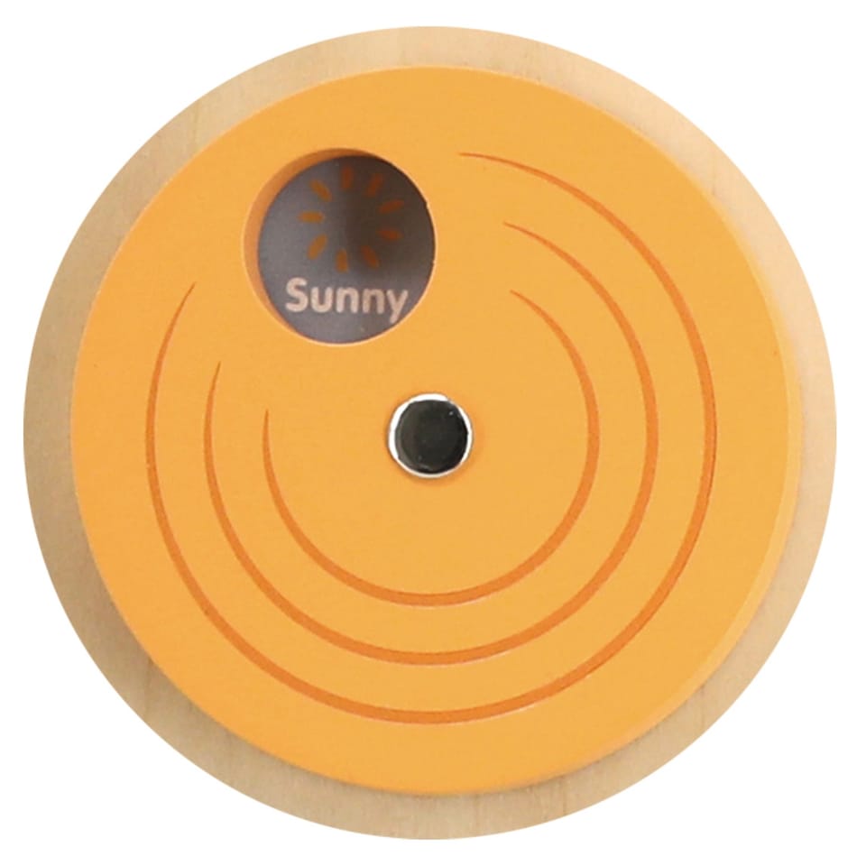 Zabawka w kształcie uroczej tablicy posiada tarczę zegara z ruchomymi wskazówkami oraz suwaki pogodowe i kalendarzowe, które uczą pogody, pór dnia, dni tygodnia, dni w miesiącu, miesięcy i pór roku. Całość wykonana jest z najwyższej jakości drewna bukowego i pomalowana nietoksycznymi farbami o stonowanych barwach, które przyciągają wzrok i zachęcają do zabawy.