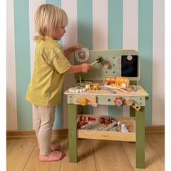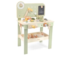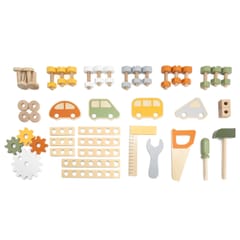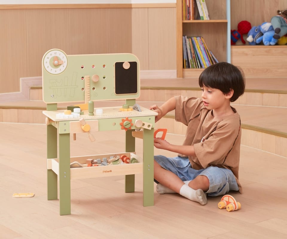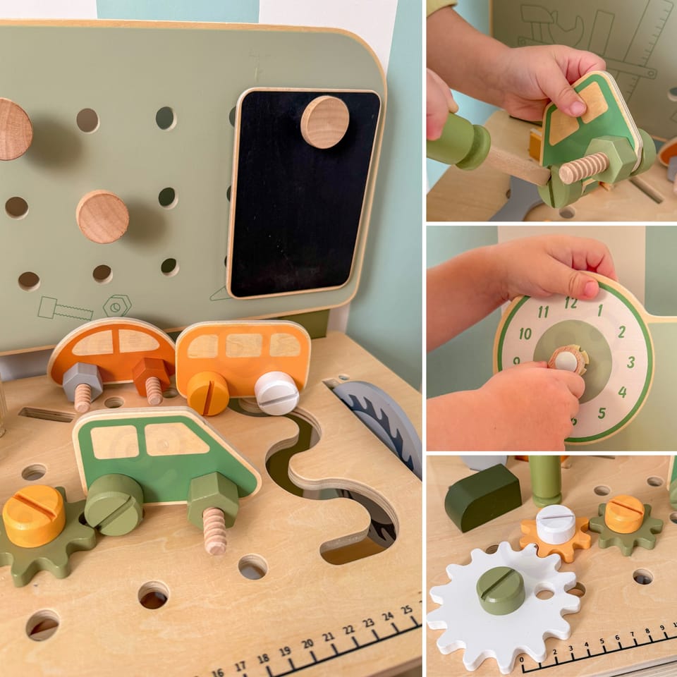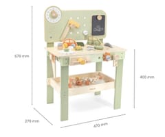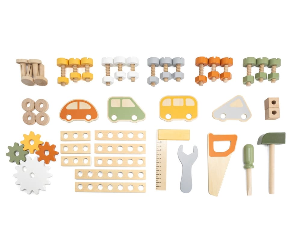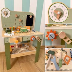 Zestaw składa się ze stołu warsztatowego, do którego przytwierdzone są ścianka z zegarem, piła „elektryczna”, imadło. Dodatkowo wiele narzędzi ręcznych – linijka, młotek, piła, oraz akcesoriów – śruby, nakrętki, łączniki i inne kreatywne części do budowania.