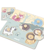 Zestaw barwnych puzzli od firmy Viga to idealna zabawka, która nie tylko stanowi tradycyjną układankę, ale także pozwala dziecku poznać pierwsze zwierzątka, takie jak lisek, jeżyk, słonik, zeberka i lewus. Wspaniała łamigłówka składa się z płaskiej podstawki i elementów z drewna, które łączą się ze sobą za pomocą uchwytów. Tego rodzaju układanka stymuluje logiczne myślenie i rozwija umiejętność koncentracji u najmłodszych dzieci.