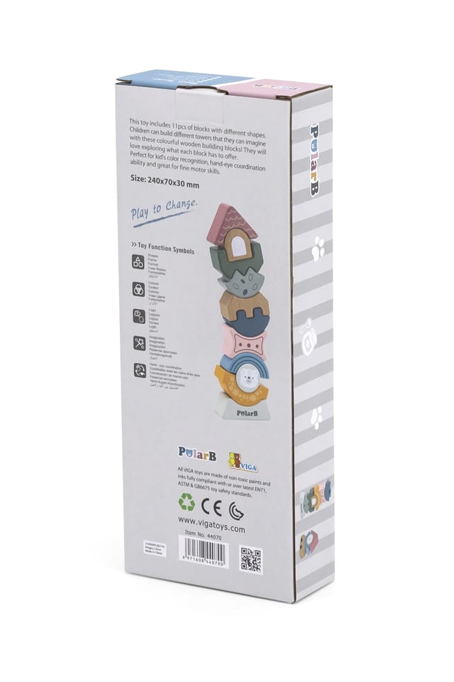Gra która z pewnością wciągnie dziecko do twórczej zabawy kształtującej jego wyobraźnię. Wieża Viga to idealny prezent dla dziecka – który wspomoże jego rozwój i ułatwi edukację. Z tą zabawką dziecko przyswaja i uczy się kolorów. Wieża od VIGA wspomaga naukę liczenia a także koordynację ręka - oko. Celem gry jest dopasowanie przez malucha jak puzzle pięknie pomalowanych 11 klocków o różnych kształtach i zbudowanie z nich jak najwyższej wieży tak aby się nie przewróciła. Można zbudować więcej niż jedną wieżę.