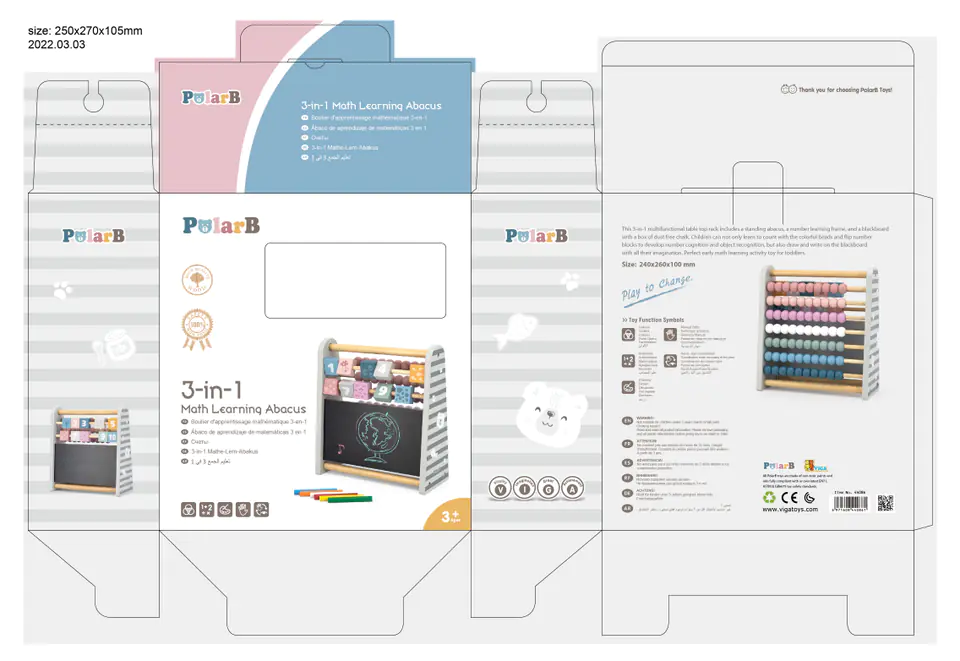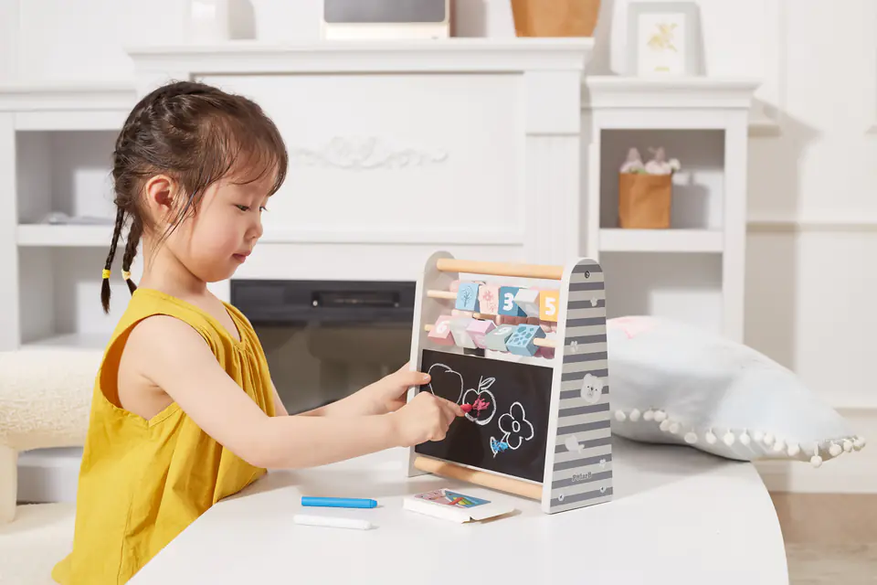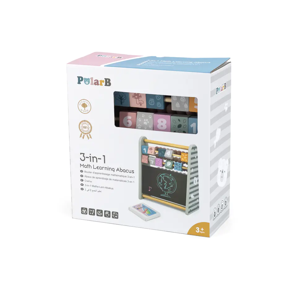 Przedstawiamy drewnianą zabawkę marki VIGA – liczydło do nauki matematyki 3w1 z serii POLAR BEAR. Klasyczna zabawka w nowoczesnym wydaniu, idealna dla dziecka od 3 roku życia. Posiada liczydło, cyferki i tablice do malowania kredą. Pomaga w poznawaniu cyfr i zdobywaniu umiejętności liczenia. Pobudza naukę logicznego myślenia, koncentrację, koordynację i zdolności manualne.Liczydło 3w1 jest ponadczasową zabawką dla małych geniuszy. Jego wielofunkcyjność pozwala na rozwiązywanie pierwszych matematycznych zagadek, tablica zaś umożliwia naukę pisania pierwszych znaków. Do zabawki załączono opakowanie kolorowej kredy.Całość wykonana została z drewna bukowego i pomalowana nietoksycznymi farbami o stonowanych barwach, które przyciągną wzrok oraz zachęcą do zabawy dając jednocześnie mnóstwo radości z zabawy. Farby są w 100% bezpieczne, spełniają normy bezpieczeństwa EN71 i ASTM.Zabawka jest zapakowana w kolorowe opakowanie. Dzięki estetycznemu opakowaniu zabawka jest idealna na prezent.Zabawka przeznaczona dla maluchów powyżej 36. miesiąca życia. Cała seria zabawek POLAR BEAR została stworzona przez firmę VIGA aby sprostać oczekiwaniom rodziców i dzieci w doskonaleniu procesu ich rozwoju poprzez zabawę.DANE TECHNICZNE:Wymiar produktu:dł: 260mm x wys: 240mm x szer: 99mmWymiary opakowania:dł: 250mm x wys: 270mm x szer: 105mm Opisy