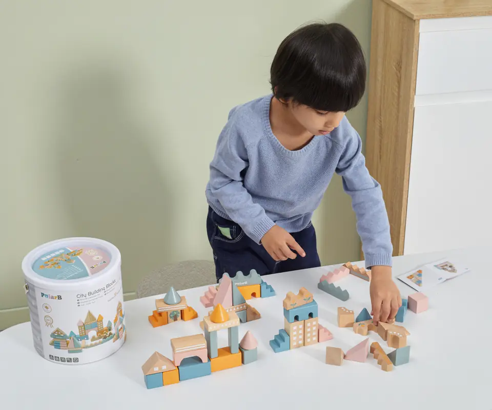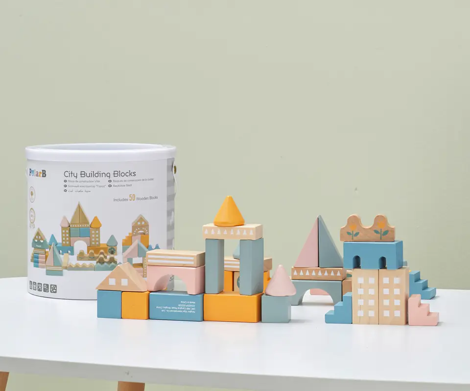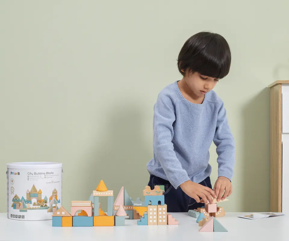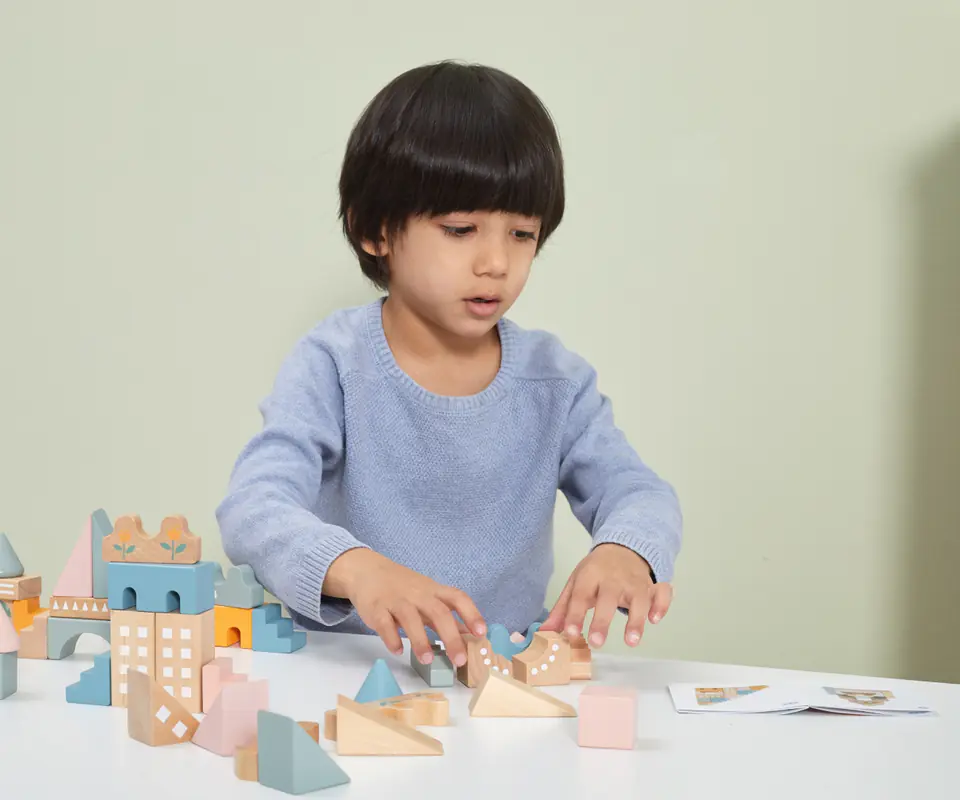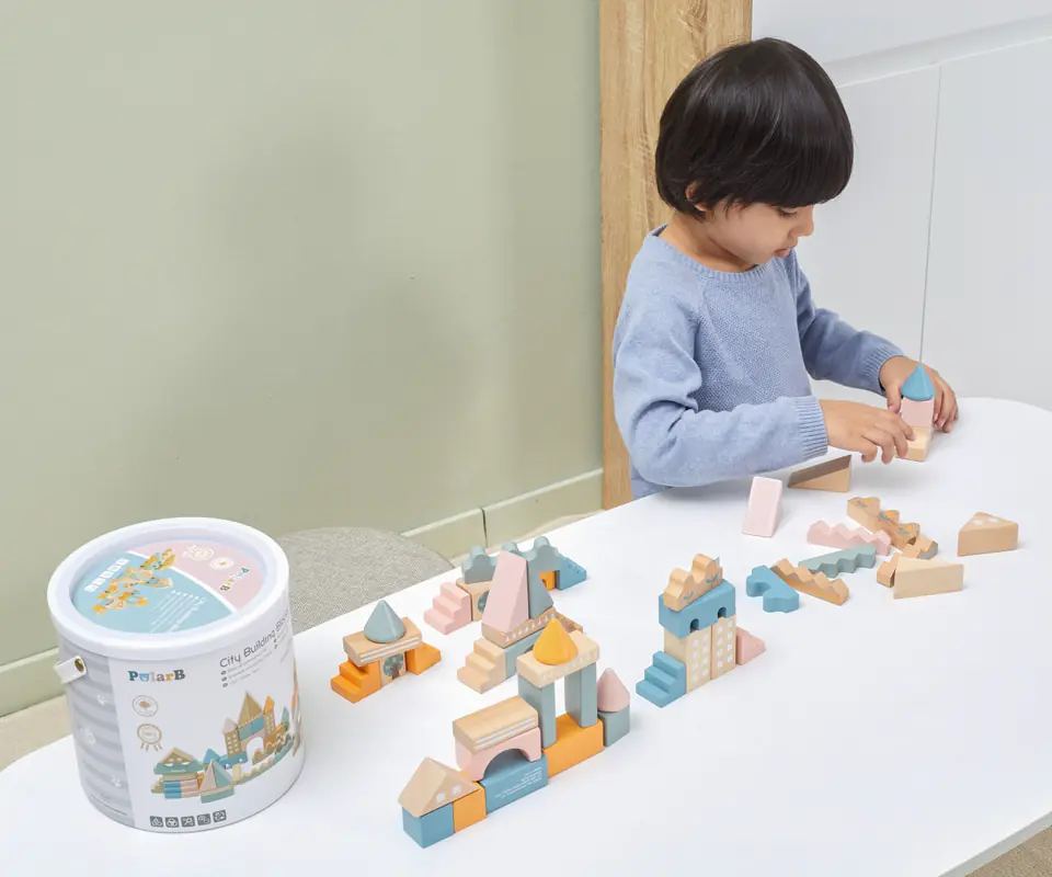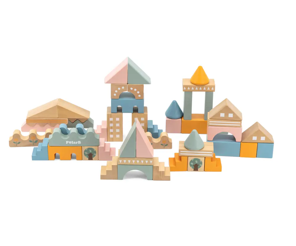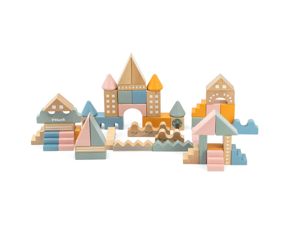 Zabawka składa się z 50 drewnianych elementów w różnych kombinacjach kolorów i kształtów. Klocki można układać dopasowując odpowiednie elementy i tworząc liczne budowle oraz konstrukcje. To również doskonała zabawka do integracji w grupie. Dzieci mogą wspólnie tworzyć swoje unikalne projekty, co rozwija umiejętności interpersonalne i zdolność do współpracy.