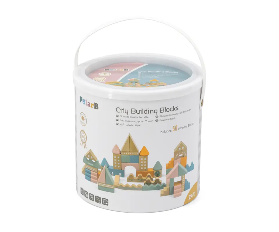 Klocki zapakowane są w plastikowe wiaderko z rączką co ułatwi przenoszenie ich w dowolne miejsce. Do zestawu dołączona jest książeczka z przykładami.