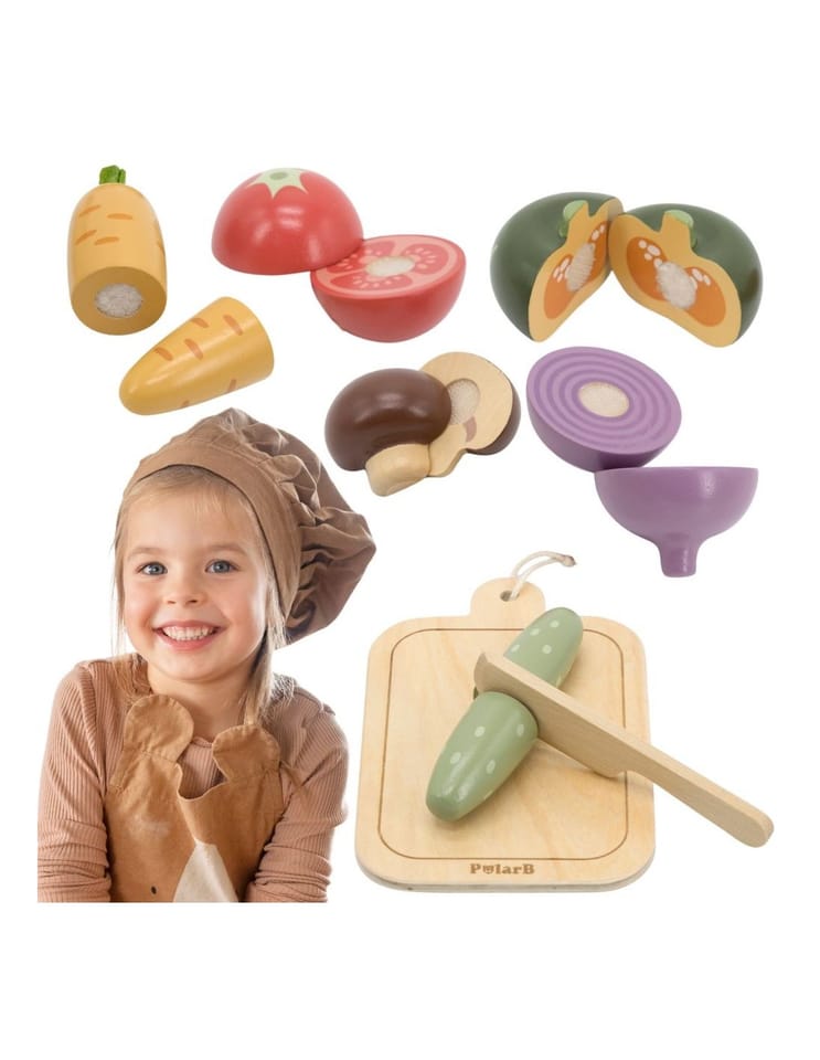 Zestaw do krojenia na desce- warzywa dla kucharzy spodoba się chłopcom i dziewczętom w wieku przedszkolnym. Drewniane warzywa pozwalają urozmaicić gry fabularne, uzupełnić zabawkowe kuchnie, nauczyć się przyrządzania prostych potraw.
