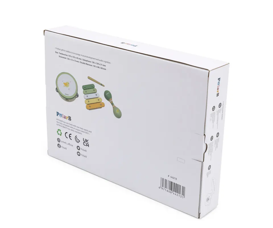 Przedstawiamy drewnianą zabawkę marki VIGA – zestaw instrumentów muzycznych z serii PolarB. Jest idealny dla dzieci od 12 miesiąca życia, dzięki różnorodności elementów wspiera rozwój słuchowy jak i ruchowy. W skład zestawu zalicza się tamburyn, podwójne marakasy i ksylofon z pałeczką perkusyjną. Zabawka pozwala na zapoznanie się z różnorodnością dźwięków oraz układanie pierwszych kompozycji. Zestaw daje możliwość jednoczesnej zabawy kilkorga dzieci ucząc współpracy w grupie. Nie tylko dostarcza rozrywki, ale także może wprowadzać w fascynujący świat dźwięków i muzyki, rozwijając ich zainteresowanie tym obszarem oraz umiejętności kreatywne i poznawcze.Całość wykonana została z drewna bukowego i pomalowana nietoksycznymi farbami o stonowanych barwach, które przyciągną wzrok oraz zachęcą do zabawy dając jednocześnie mnóstwo radości. Farby są w 100% bezpieczne, spełniają normy bezpieczeństwa EN71 i ASTM.Zestaw jest estetycznie zapakowany w kolorowe kartonowe pudełko, w sam raz na prezent.Zabawka przeznaczona dla maluchów powyżej 12. miesiąca życia. Cała seria zabawek PolarB została stworzona przez firmę VIGA aby sprostać oczekiwaniom rodziców i dzieci w doskonaleniu procesu ich rozwoju poprzez zabawę. Wymiar produktu:Tamburynek- dł. 153 mm x wys. 45 mm x szer. 153 mmXylofon- dł. 130 mm x wys. 31 mm x szer. 130 mmMarakasy- dł. 145 mm x wys. 48 mm x szer. 48 mmPałeczka- dł. 120 mm x wys. 15 mm x szer. 15 mmWymiary opakowania: Dł. 360 mm x wys. 60 mm x szer. 225 mmWaga brutto: 0,6 kgOpisy