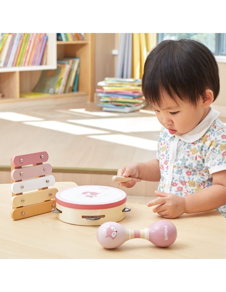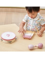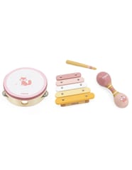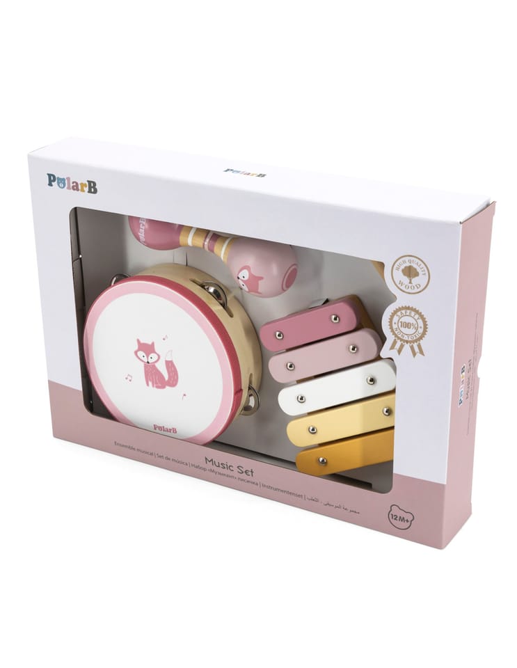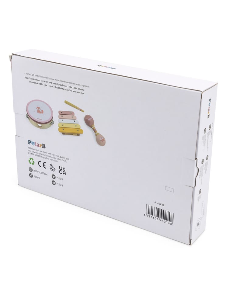 Przedstawiamy drewnianą zabawkę marki VIGA – zestaw instrumentów muzycznych z serii PolarB. Jest idealny dla dzieci od 12 miesiąca życia, dzięki różnorodności elementów wspiera rozwój słuchowy jak i ruchowy. W skład zestawu zalicza się tamburyn, podwójne marakasy i ksylofon z pałeczką perkusyjną. Zabawka pozwala na zapoznanie się z różnorodnością dźwięków oraz układanie pierwszych kompozycji. Zestaw daje możliwość jednoczesnej zabawy kilkorga dzieci ucząc współpracy w grupie. Nie tylko dostarcza rozrywki, ale także może wprowadzać w fascynujący świat dźwięków i muzyki, rozwijając ich zainteresowanie tym obszarem oraz umiejętności kreatywne i poznawcze.Całość wykonana została z drewna bukowego i pomalowana nietoksycznymi farbami o stonowanych barwach, które przyciągną wzrok oraz zachęcą do zabawy dając jednocześnie mnóstwo radości. Farby są w 100% bezpieczne, spełniają normy bezpieczeństwa EN71 i ASTM.Zestaw jest estetycznie zapakowany w kolorowe kartonowe pudełko, w sam raz na prezent.Zabawka przeznaczona dla maluchów powyżej 12. miesiąca życia. Cała seria zabawek PolarB została stworzona przez firmę VIGA aby sprostać oczekiwaniom rodziców i dzieci w doskonaleniu procesu ich rozwoju poprzez zabawę.Wymiar produktu:Tamburynek- dł. 153 mm x wys. 45 mm x szer. 153 mmXylofon- dł. 130 mm x wys. 31 mm x szer. 130 mmMarakasy- dł. 145 mm x wys. 48 mm x szer. 48 mmPałeczka- dł. 120 mm x wys. 15 mm x szer. 15 mmWymiary opakowania: Dł. 360 mm x wys. 60 mm x szer. 225 mmWaga brutto: 0,6 kgOpisy