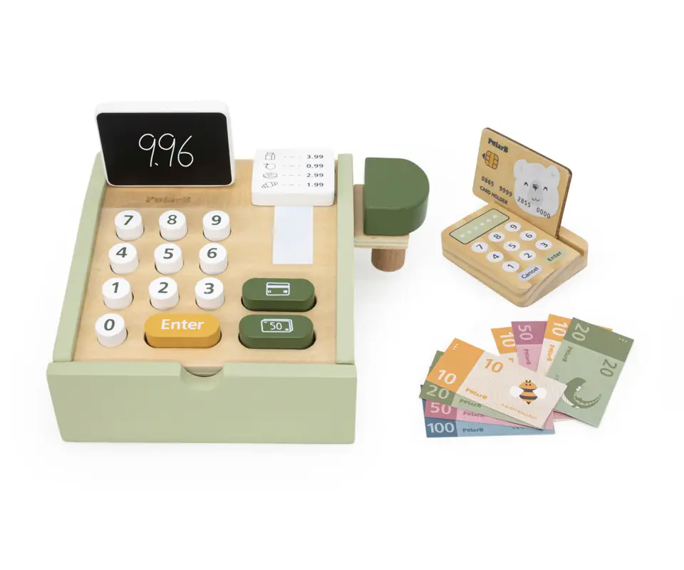 Kasa sklepowa od firmy Viga to idealny prezent, który ucieszy każde dziecko. Zabawa w sklep – któż z nas się w nią nie bawił… Drewniana kasa sklepowa wprowadzi Twoje dziecko w ekscytującą zabawę jako kasjer lub sprzedawca w supermarkecie, sklepie z odzieżą, czy też kwiaciarni. Rozwija wyobraźnię i fantazję, wspomaga naukę liczenia, jak posługiwać się pieniędzmi oraz wzbogaci umiejętności społeczne. Sprzęt pomoże rozwinąć u dziecka logiczne myślenie i zdolności manualne. Dodatkowo pomoże zrozumieć wartość pieniądza i podstawy matematyki.Zestaw zawiera:- skaner kodów produktów- wyświetlacz cen- klawiatura z cyframi 0-9- 3 przyciski: otwarcie/ karta/ gotówka- plansza z cenami 4 produktów- wysuwana szuflada z 2 przegródkami na monety i banknoty- czytnik kart płatniczych- 1 kartę kredytową- 10 monet- 8 banknotówCałość wykonana została z drewna bukowego i pomalowana nietoksycznymi farbami w barwy, które zadowolą każdego użytkownika i dadzą mnóstwo radości z zabawy.Dzięki estetycznemu opakowaniu zabawka jest idealna na prezent!Naszym priorytetem jest bezpieczeństwo dzieci oraz najwyższa jakość zabawek, dbamy zatem o to, aby farby którymi malujemy nasze zabawki nie były toksyczne i spełniały normy bezpieczeństwa (EN71 i ASTM).Zabawka przeznaczona dla dzieci powyżej 36 miesiąca życia.Wymiar produktu:Dł. 160mm x wys. 110 mm x szer. 195 mmWaga netto: 0,51 kgWymiary opakowania:Dł. 195 mm x wys. 75 mm x szer. 165 mmWaga brutto: 0,6 kgOpisy